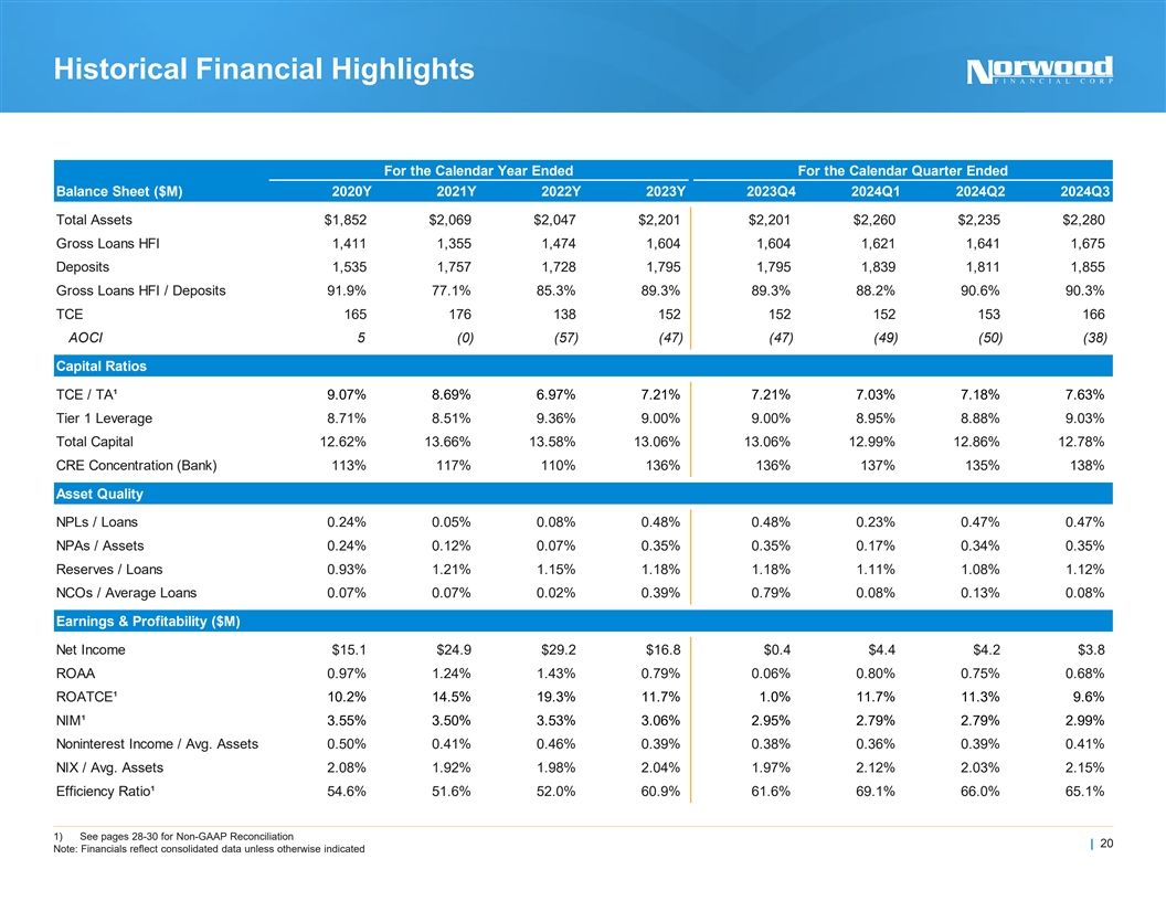 Net Interest Income & Net Interest Margin Non-GAAP Reconciliation Illustrated for Capital Offering + Securities Repositioning For the Quarter Ended: Dollars in Millions September 30, 2024 Adjustments to Net Interest Income: Net Interest Income 15.9 FTE Adjustment 0.2 Net Interest Income (FTE) 16.1 (-) Yield on Securities Sold @ 2.0% (0.8) (+) Funding Savings on the Repayment of the BTFP / Wholesale Borrowings @ 4.8% 0.7 (-) Reinvestment of Anticipated Cash Flow (0.1) (+) Yield on Securities Purchased @ 5.0% 1.3 (+) Yield on Net Offering Proceeds @ 5.0% 0.3 Total Adjustments 1.5 Adjusted Net Interest Income (FTE) 17.6 A Adjustments to Average Earning Assets: Average Earning Assets 2,147.9 (+) Net Proceeds from Capital Offering 27.9 (-) Market Value of Securities Sold (166.6) (+) Market Value of Securities Purchased 107.0 Total Adjustments (31.7) Adjusted Average Earning Assets 2,116.1 B Illustrative Net Interest Margin (FTE) for Capital & Repositioning 3.33% A / B * 4 Note: There can be no assurance that we will complete the repositioning as planned, that the underlying assumptions will be realized or that actual results will not differ | 19 materially from these illustrations