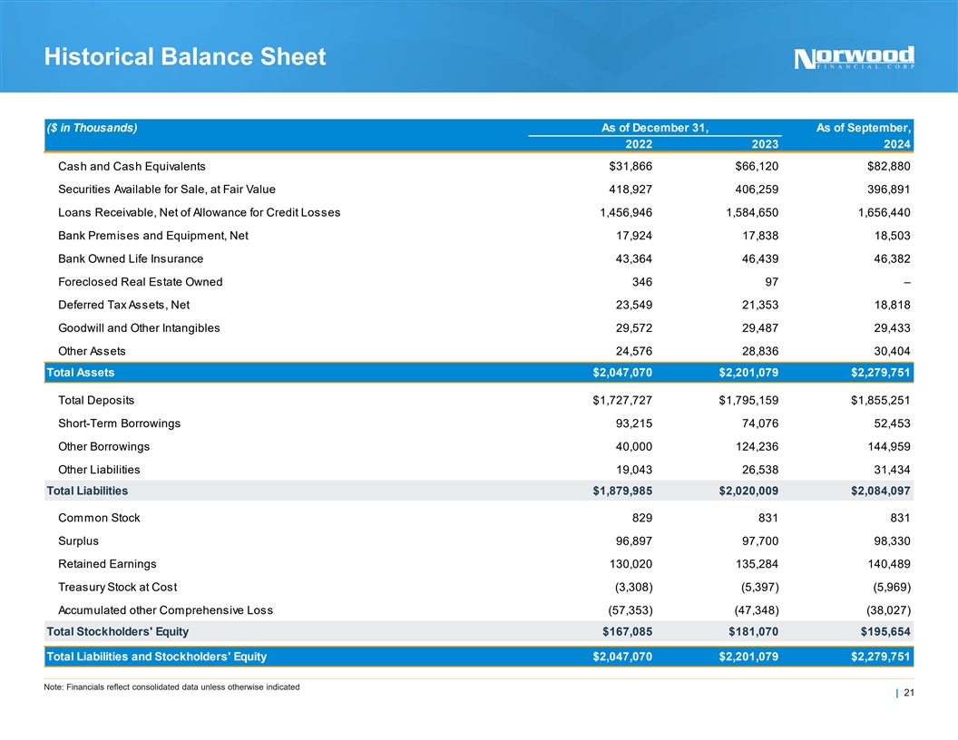 Historical Financial Highlights For the Calendar Year Ended For the Calendar Quarter Ended Balance Sheet ($M) 2020Y 2021Y 2022Y 2023Y 2023Q4 2024Q1 2024Q2 2024Q3 Total Assets $1,852 $2,069 $2,047 $2,201 $2,201 $2,260 $2,235 $2,280 Gross Loans HFI 1,411 1,355 1,474 1,604 1,604 1,621 1,641 1,675 Deposits 1,535 1,757 1,728 1,795 1,795 1,839 1,811 1,855 Gross Loans HFI / Deposits 91.9% 77.1% 85.3% 89.3% 89.3% 88.2% 90.6% 90.3% TCE 165 176 138 152 152 152 153 166 AOCI 5 (0) (57) (47) (47) (49) (50) (38) Capital Ratios TCE / TA¹ 9.07% 8.69% 6.97% 7.21% 7.21% 7.03% 7.18% 7.63% Tier 1 Leverage 8.71% 8.51% 9.36% 9.00% 9.00% 8.95% 8.88% 9.03% Total Capital 12.62% 13.66% 13.58% 13.06% 13.06% 12.99% 12.86% 12.78% CRE Concentration (Bank) 113% 117% 110% 136% 136% 137% 135% 138% Asset Quality NPLs / Loans 0.24% 0.05% 0.08% 0.48% 0.48% 0.23% 0.47% 0.47% NPAs / Assets 0.24% 0.12% 0.07% 0.35% 0.35% 0.17% 0.34% 0.35% Reserves / Loans 0.93% 1.21% 1.15% 1.18% 1.18% 1.11% 1.08% 1.12% NCOs / Average Loans 0.07% 0.07% 0.02% 0.39% 0.79% 0.08% 0.13% 0.08% Earnings & Profitability ($M) Net Income $15.1 $24.9 $29.2 $16.8 $0.4 $4.4 $4.2 $3.8 ROAA 0.97% 1.24% 1.43% 0.79% 0.06% 0.80% 0.75% 0.68% ROATCE¹ 10.2% 14.5% 19.3% 11.7% 1.0% 11.7% 11.3% 9.6% NIM¹ 3.55% 3.50% 3.53% 3.06% 2.95% 2.79% 2.79% 2.99% Noninterest Income / Avg. Assets 0.50% 0.41% 0.46% 0.39% 0.38% 0.36% 0.39% 0.41% NIX / Avg. Assets 2.08% 1.92% 1.98% 2.04% 1.97% 2.12% 2.03% 2.15% Efficiency Ratio¹ 54.6% 51.6% 52.0% 60.9% 61.6% 69.1% 66.0% 65.1% 1) See pages 28-30 for Non-GAAP Reconciliation | 20 Note: Financials reflect consolidated data unless otherwise indicated