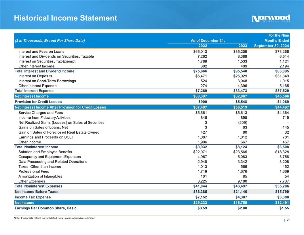 Historical Balance Sheet ($ in Thousands) As of December 31, As of September, 2022 2023 2024 Cash and Cash Equivalents $31,866 $66,120 $82,880 Securities Available for Sale, at Fair Value 418,927 406,259 396,891 Loans Receivable, Net of Allowance for Credit Losses 1,456,946 1,584,650 1,656,440 Bank Premises and Equipment, Net 17,924 17,838 18,503 Bank Owned Life Insurance 43,364 46,439 46,382 Foreclosed Real Estate Owned 346 97 – Deferred Tax Assets, Net 23,549 21,353 18,818 Goodwill and Other Intangibles 29,572 29,487 29,433 Other Assets 24,576 28,836 30,404 Total Assets $2,047,070 $2,201,079 $2,279,751 Total Deposits $1,727,727 $1,795,159 $1,855,251 Short-Term Borrowings 93,215 74,076 52,453 Other Borrowings 40,000 124,236 144,959 Other Liabilities 19,043 26,538 31,434 Total Liabilities $1,879,985 $2,020,009 $2,084,097 Common Stock 829 831 831 Surplus 96,897 97,700 98,330 Retained Earnings 130,020 135,284 140,489 Treasury Stock at Cost (3,308) (5,397) (5,969) Accumulated other Comprehensive Loss (57,353) (47,348) (38,027) Total Stockholders' Equity $167,085 $181,070 $195,654 Total Liabilities and Stockholders' Equity $2,047,070 $2,201,079 $2,279,751 Note: Financials reflect consolidated data unless otherwise indicated | 21