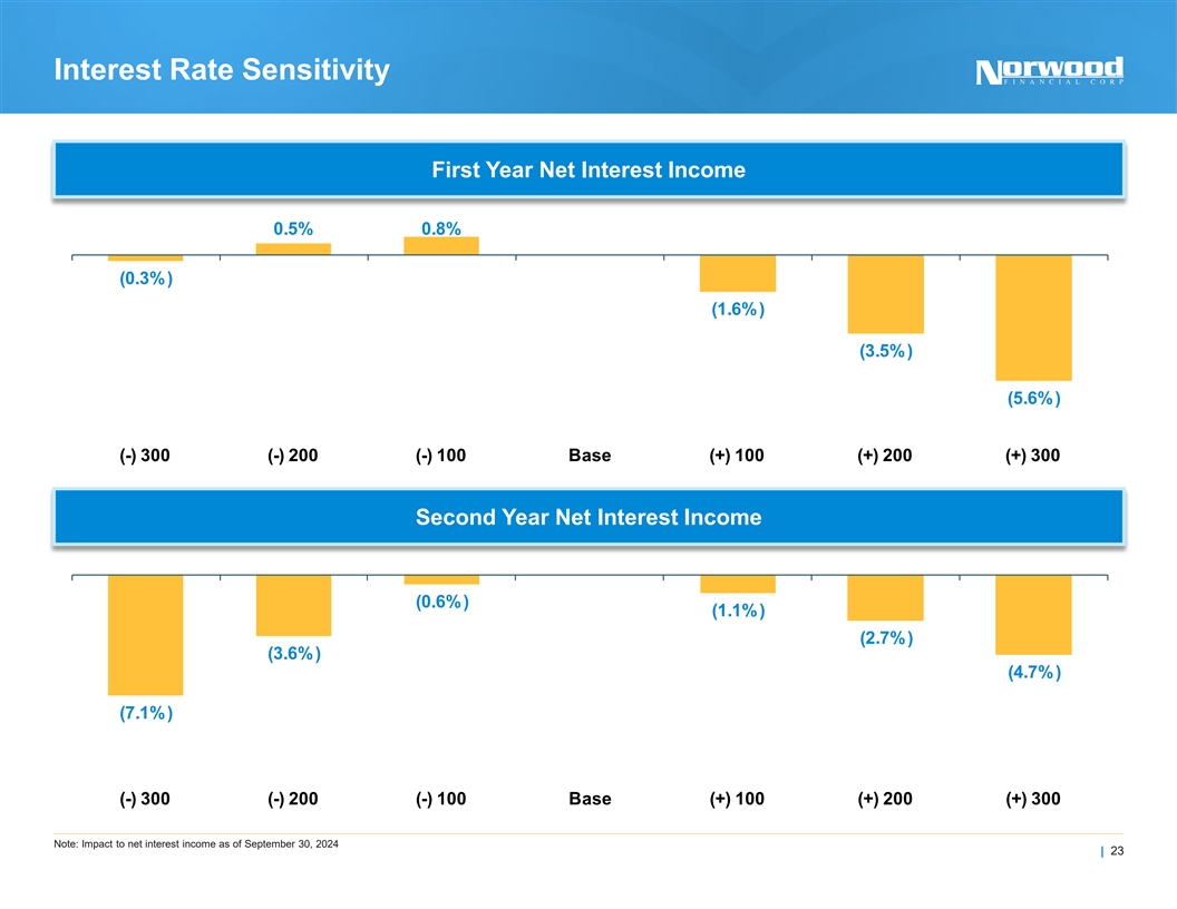 Historical Income Statement For the Nine ($ in Thousands, Except Per Share Data) As of December 31, Months Ended 2022 2023 September 30, 2024 Interest and Fees on Loans $66,013 $85,209 $73,266 Interest and Dividends on Securities, Taxable 7,262 8,389 6,514 Interest on Securities, Tax-Exempt 1,789 1,533 1,121 Other Interest Income 602 409 2,194 Total Interest and Dividend Income $75,666 $95,540 $83,095 Interest on Deposits $6,471 $26,029 $31,349 Interest on Short-Term Borrowings 524 3,048 1,015 Other Interest Expense 274 4,396 5,165 Total Interest Expense $7,269 $33,473 $37,529 Net Interest Income $68,397 $62,067 $45,566 Provision for Credit Losses $900 $5,548 $1,069 Net Interest Income After Provision for Credit Losses $67,497 $56,519 $44,497 Service Charges and Fees $5,661 $5,613 $4,364 Income from Fiduciary Activities 845 898 719 Net Realized Gains (Losses) on Sales of Securities 3 (209) – Gains on Sales of Loans, Net 3 63 145 Gain on Sales of Foreclosed Real Estate Owned 427 80 32 Earnings and Proceeds on BOLI 1,087 1,012 781 Other Income 1,906 667 467 Total Noninterest Income $9,932 $8,124 $6,508 Salaries and Employee Benefits $22,071 $23,565 $18,328 Occupancy and Equipment Expenses 4,967 5,083 3,758 Data Processing and Related Operations 2,948 3,342 3,208 Taxes, Other than Income 1,013 566 452 Professional Fees 1,719 1,676 1,669 Amortization of Intangibles 101 85 54 Other Expenses 8,225 9,180 7,737 Total Noninterest Expenses $41,044 $43,497 $35,206 Net Income Before Taxes $36,385 $21,146 $15,799 Income Tax Expense $7,152 $4,387 $3,308 Net Income $29,233 $16,759 $12,491 Earnings Per Common Share, Basic $3.59 $2.08 $1.55 Note: Financials reflect consolidated data unless otherwise indicated | 22