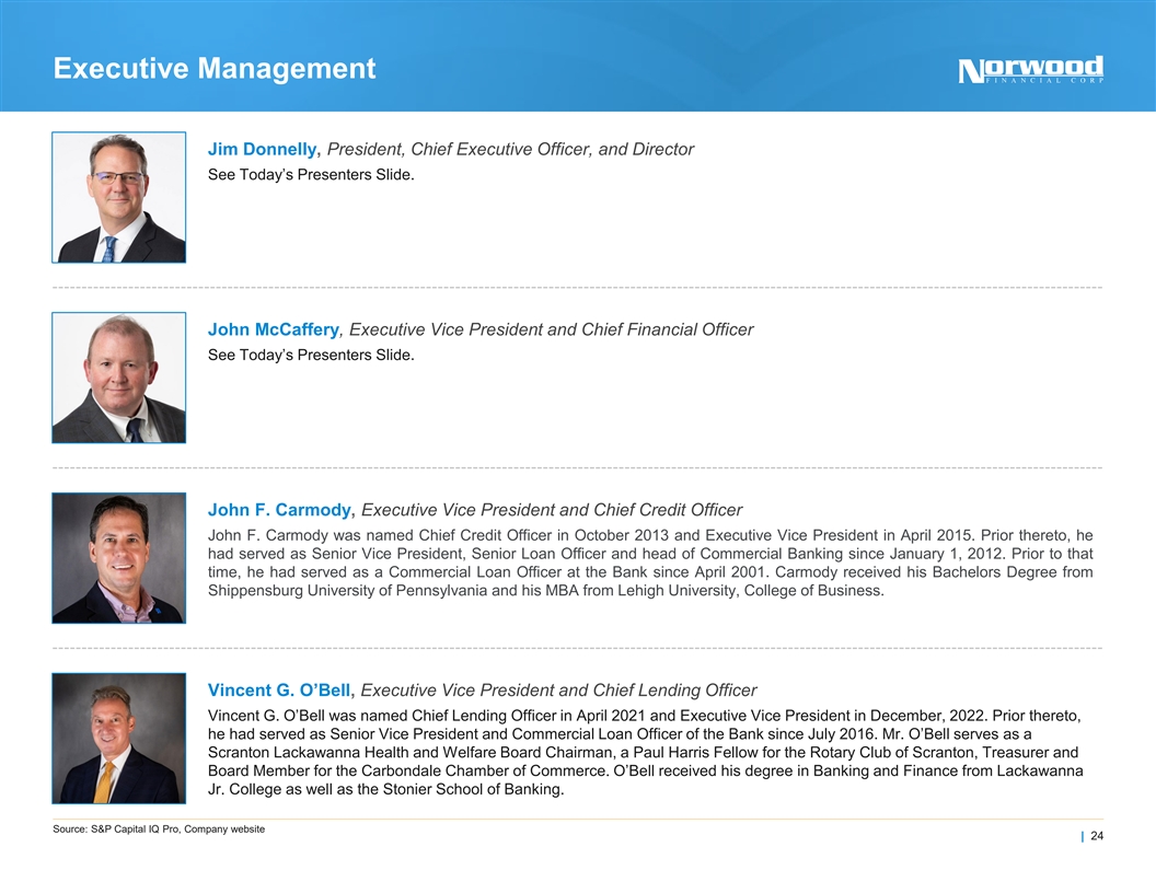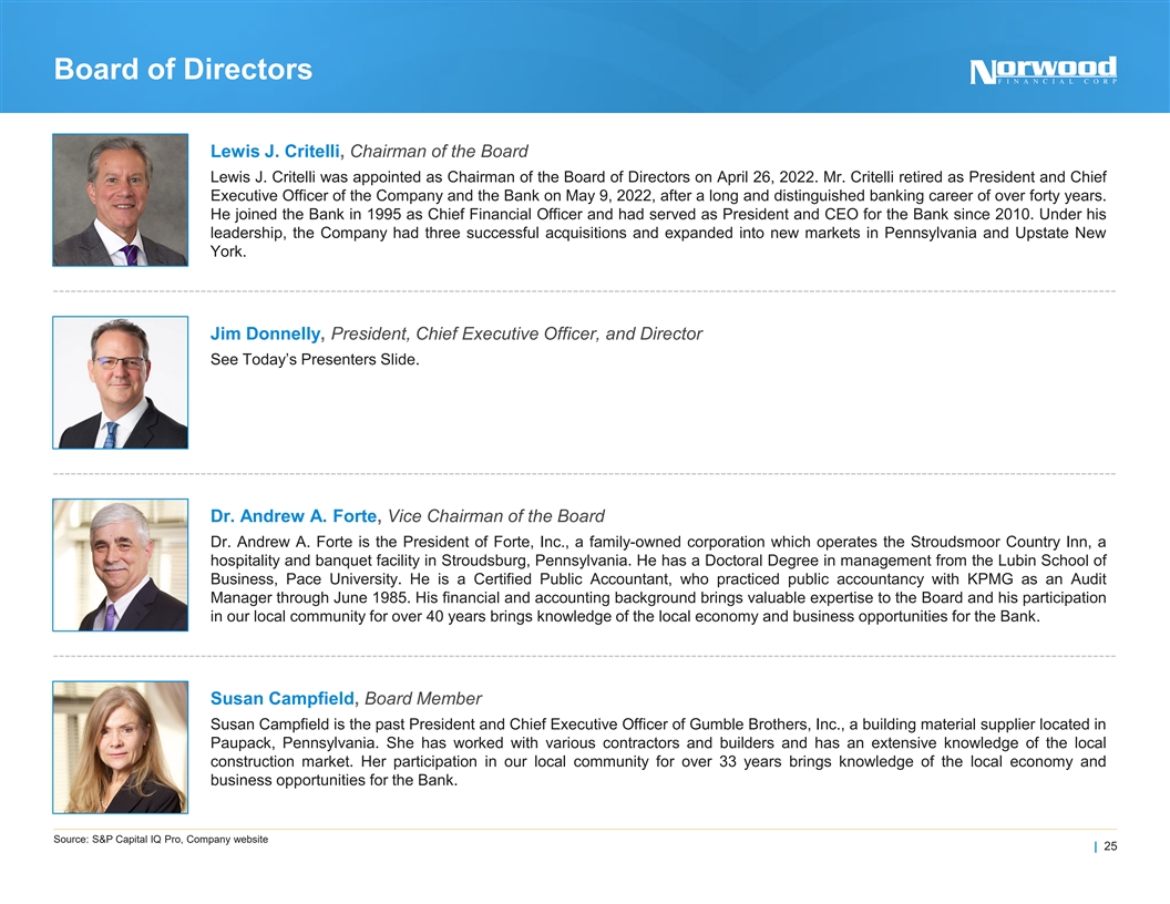 Executive Management Jim Donnelly, President, Chief Executive Officer, and Director See Today’s Presenters Slide. John McCaffery, Executive Vice President and Chief Financial Officer See Today’s Presenters Slide. John F. Carmody, Executive Vice President and Chief Credit Officer John F. Carmody was named Chief Credit Officer in October 2013 and Executive Vice President in April 2015. Prior thereto, he had served as Senior Vice President, Senior Loan Officer and head of Commercial Banking since January 1, 2012. Prior to that time, he had served as a Commercial Loan Officer at the Bank since April 2001. Carmody received his Bachelors Degree from Shippensburg University of Pennsylvania and his MBA from Lehigh University, College of Business. Vincent G. O’Bell, Executive Vice President and Chief Lending Officer Vincent G. O’Bell was named Chief Lending Officer in April 2021 and Executive Vice President in December, 2022. Prior thereto, he had served as Senior Vice President and Commercial Loan Officer of the Bank since July 2016. Mr. O’Bell serves as a Scranton Lackawanna Health and Welfare Board Chairman, a Paul Harris Fellow for the Rotary Club of Scranton, Treasurer and Board Member for the Carbondale Chamber of Commerce. O’Bell received his degree in Banking and Finance from Lackawanna Jr. College as well as the Stonier School of Banking. Source: S&P Capital IQ Pro, Company website | 24