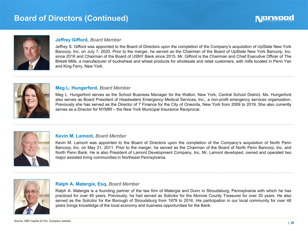 Board of Directors Lewis J. Critelli, Chairman of the Board Lewis J. Critelli was appointed as Chairman of the Board of Directors on April 26, 2022. Mr. Critelli retired as President and Chief Executive Officer of the Company and the Bank on May 9, 2022, after a long and distinguished banking career of over forty years. He joined the Bank in 1995 as Chief Financial Officer and had served as President and CEO for the Bank since 2010. Under his leadership, the Company had three successful acquisitions and expanded into new markets in Pennsylvania and Upstate New York. Jim Donnelly, President, Chief Executive Officer, and Director See Today’s Presenters Slide. Dr. Andrew A. Forte, Vice Chairman of the Board Dr. Andrew A. Forte is the President of Forte, Inc., a family-owned corporation which operates the Stroudsmoor Country Inn, a hospitality and banquet facility in Stroudsburg, Pennsylvania. He has a Doctoral Degree in management from the Lubin School of Business, Pace University. He is a Certified Public Accountant, who practiced public accountancy with KPMG as an Audit Manager through June 1985. His financial and accounting background brings valuable expertise to the Board and his participation in our local community for over 40 years brings knowledge of the local economy and business opportunities for the Bank. Susan Campfield, Board Member Susan Campfield is the past President and Chief Executive Officer of Gumble Brothers, Inc., a building material supplier located in Paupack, Pennsylvania. She has worked with various contractors and builders and has an extensive knowledge of the local construction market. Her participation in our local community for over 33 years brings knowledge of the local economy and business opportunities for the Bank. Source: S&P Capital IQ Pro, Company website | 25