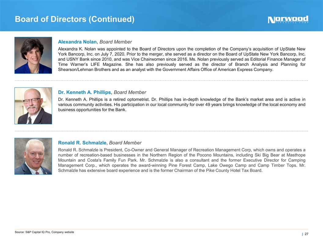 Board of Directors (Continued) Jeffrey Gifford, Board Member Jeffrey S. Gifford was appointed to the Board of Directors upon the completion of the Company’s acquisition of UpState New York Bancorp, Inc. on July 7, 2020. Prior to the merger, he served as the Chairman of the Board of UpState New York Bancorp, Inc. since 2016 and Chairman of the Board of USNY Bank since 2015. Mr. Gifford is the Chairman and Chief Executive Officer of The Birkett Mills, a manufacturer of buckwheat and wheat products for wholesale and retail customers, with mills located in Penn Yan and King Ferry, New York. Meg L. Hungerford, Board Member Meg L. Hungerford serves as the School Business Manager for the Walton, New York, Central School District. Ms. Hungerford also serves as Board President of Headwaters Emergency Medical Services, Inc., a non-profit emergency services organization. Previously she has served as the Director of 7 Finance for the City of Oneonta, New York from 2009 to 2019. She also currently serves as a Director for NYMIR – the New York Municipal Insurance Reciprocal. Kevin M. Lamont, Board Member Kevin M. Lamont was appointed to the Board of Directors upon the completion of the Company’s acquisition of North Penn Bancorp, Inc. on May 31, 2011. Prior to the merger, he served as the Chairman of the Board of North Penn Bancorp, Inc. and North Penn Bank. He is also President of Lamont Development Company, Inc. Mr. Lamont developed, owned and operated two major assisted living communities in Northeast Pennsylvania. Ralph A. Matergia, Esq, Board Member Ralph A. Matergia is a founding partner of the law firm of Matergia and Dunn in Stroudsburg, Pennsylvania with which he has practiced for over 49 years. Previously, he had served as Solicitor for the Monroe County Treasurer for over 30 years. He also served as the Solicitor for the Borough of Stroudsburg from 1979 to 2016. His participation in our local community for over 48 years brings knowledge of the local economy and business opportunities for the Bank. Source: S&P Capital IQ Pro, Company website | 26