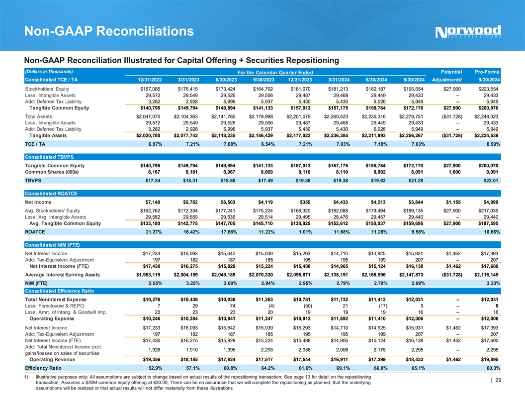 Non-GAAP Reconciliations Non-GAAP Reconciliation Illustrated for Capital Offering + Securities Repositioning (Dollars in Thousands) For the Calendar Year Ended Consolidated TCE / TA 2020 2021 2022 2023 2024 YTD Stockholders' Equity $194,785 $205,262 $167,085 $181,070 $195,654 Less: Intangible Assets 29,820 29,673 29,572 29,487 29,433 Add: Deferred Tax Liability 379 1,808 3,282 5,430 5,949 Tangible Common Equity $165,344 $177,397 $140,795 $157,013 $172,170 Total Assets $1,851,864 $2,068,504 $2,047,070 $2,201,079 $2,279,751 Less: Intangible Assets 29,820 29,673 29,572 29,487 29,433 Add: Deferred Tax Liability 379 1,808 3,282 5,430 5,949 Tangible Assets $1,822,423 $2,040,639 $2,020,780 $2,177,022 $2,256,267 TCE / TA 9.07% 8.69% 6.97% 7.21% 7.63% Consolidated TBVPS Tangible Common Equity $165,344 $177,397 $140,795 $157,013 $172,170 Common Shares (000s) 8,226 8,201 8,167 8,110 8,091 TBVPS $20.10 $21.63 $17.24 $19.36 $21.28 Consolidated ROATCE Net Income $15,080 $24,915 $29,233 $16,759 $12,491 Avg. Stockholders' Equity $166,427 $201,681 $181,499 $173,274 $183,593 Less: Avg. Intangible Assets 17,942 29,738 29,618 29,526 29,457 Avg. Tangible Common Equity $148,485 $171,943 $151,881 $143,748 $154,136 ROATCE 10.16% 14.49% 19.25% 11.66% 10.82% Consolidated NIM (FTE) Net Interest Income $50,476 $65,313 $68,397 $62,067 $45,566 Add: Tax-Equivalent Adjustment 883 787 767 749 601 Net Interest Income (FTE) $51,359 $66,100 $69,164 $62,816 $46,167 Average Interest Earning Assets $1,447,106 $1,886,269 $1,962,097 $2,055,433 $2,151,539 NIM (FTE) 3.55% 3.50% 3.53% 3.06% 2.87% Consolidated Efficiency Ratio Total Noninterest Expense $32,391 $38,578 $40,617 $43,417 $35,174 Less: Foreclosure & REPO 53 79 (354) 49 13 Less: Amrt. of Intang. & Goodwill Imp. 114 123 101 85 54 Operating Expense $32,224 $38,376 $40,870 $43,283 $35,107 Net Interest Income $50,476 $65,313 $68,397 $62,067 $45,566 Add: Tax-Equivalent Adjustment 883 787 767 749 601 Net Interest Income (FTE) $51,359 $66,100 $69,164 $62,816 $46,167 Add: Total Noninterest Income 7,709 8,233 9,502 8,253 6,476 Operating Revenue $59,068 $74,333 $78,666 $71,069 $52,643 Efficiency Ratio 54.6% 51.6% 52.0% 60.9% 66.7% 1) Illustrative purposes only; All assumptions are subject to change based on actual results of the repositioning transaction; See page 13 for detail on the repositioning | 28 transaction; Assumes a $30M common equity offering at $30.00; There can be no assurance that we will complete the repositioning as planned, that the underlying assumptions will be realized or that actual results will not differ materially from these illustrations