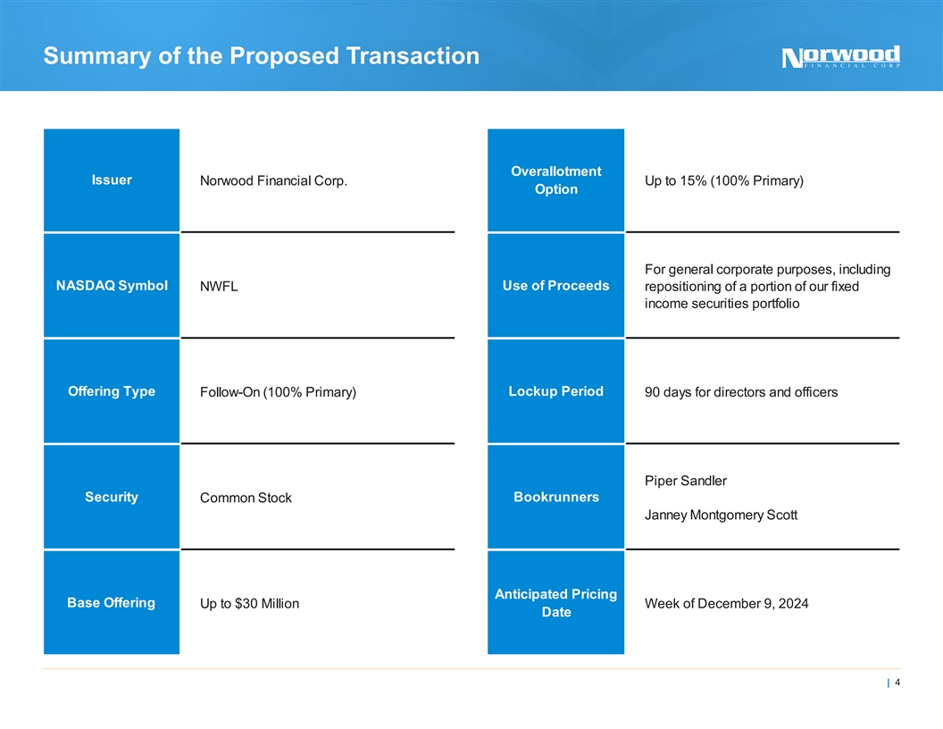 Additional Information No Offer or Solicitation This presentation is neither an offer to sell nor a solicitation of an offer to purchase any securities of the Company. There will be no sale of securities in any jurisdiction in which such an offer, solicitation or sale would be unlawful prior to registration or qualification under the securities of any such jurisdiction. Any offer to sell or solicitation of an offer to purchase securities of the Company will be made only pursuant to a prospectus supplement and prospectus filed with the U.S. Securities and Exchange Commission (“SEC”). The Company has filed a registration statement (including a prospectus) (File No. 333-279619) and a preliminary prospectus supplement with the SEC for the offering to which this presentation relates. Before making an investment decision, you should read the prospectus and preliminary prospectus supplement and the other documents that the Company has filed with the SEC for additional information about the Company and the offering. You may obtain these documents for free by visiting the SEC's website at www.sec.gov. These securities are not insured or guaranteed by the Federal Deposit Insurance Corporation (“FDIC”) or any other governmental agency or public or private insurer. Neither the SEC nor any other regulator has approved or disproved of the securities of the Company or passed on the adequacy or accuracy of this presentation. Any representation to the contrary is a criminal offense. | 3