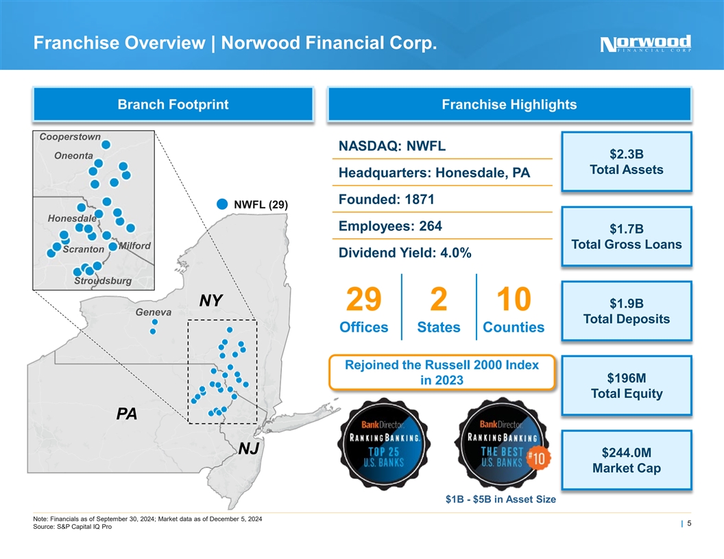 Summary of the Proposed Transaction Overallotment Issuer Norwood Financial Corp. Up to 15% (100% Primary) Option For general corporate purposes, including NASDAQ Symbol NWFL Use of Proceeds repositioning of a portion of our fixed income securities portfolio Offering Type Follow-On (100% Primary) Lockup Period 90 days for directors and officers Piper Sandler Security Bookrunners Common Stock Janney Montgomery Scott Anticipated Pricing Base Offering Up to $30 Million Week of December 9, 2024 Date | 4