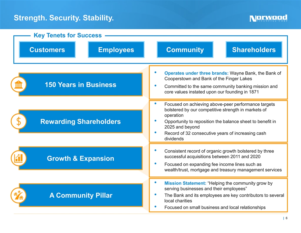 Franchise Overview | Norwood Financial Corp. Branch Footprint Franchise Highlights Cooperstown NASDAQ: NWFL Oneonta $2.3B Total Assets Headquarters: Honesdale, PA Founded: 1871 NWFL (29) Honesdale Employees: 264 $1.7B Total Gross Loans Milford Scranton Dividend Yield: 4.0% Stroudsburg NY $1.9B 29 2 10 Geneva Total Deposits Offices States Counties Rejoined the Russell 2000 Index $196M in 2023 Total Equity PA NJ $244.0M Market Cap $1B - $5B in Asset Size Note: Financials as of September 30, 2024; Market data as of December 5, 2024 | 5 Source: S&P Capital IQ Pro