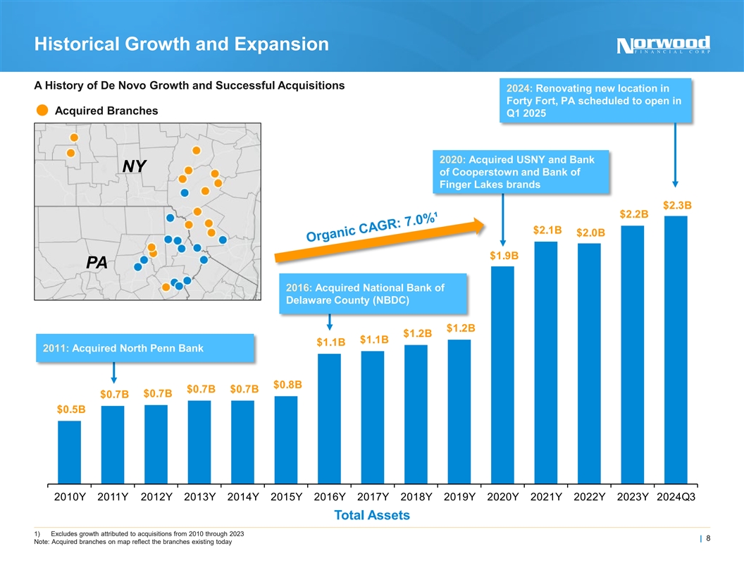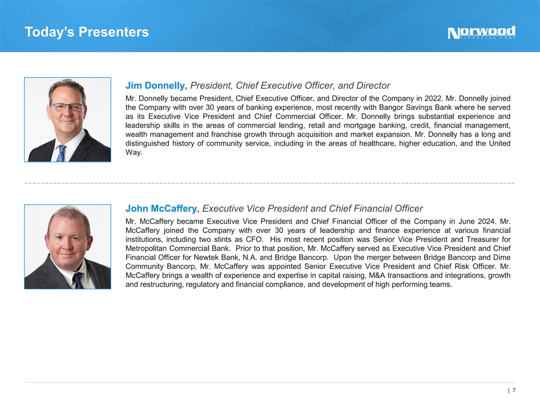 Today’s Presenters Jim Donnelly, President, Chief Executive Officer, and Director Mr. Donnelly became President, Chief Executive Officer, and Director of the Company in 2022. Mr. Donnelly joined the Company with over 30 years of banking experience, most recently with Bangor Savings Bank where he served as its Executive Vice President and Chief Commercial Officer. Mr. Donnelly brings substantial experience and leadership skills in the areas of commercial lending, retail and mortgage banking, credit, financial management, wealth management and franchise growth through acquisition and market expansion. Mr. Donnelly has a long and distinguished history of community service, including in the areas of healthcare, higher education, and the United Way. John McCaffery, Executive Vice President and Chief Financial Officer Mr. McCaffery became Executive Vice President and Chief Financial Officer of the Company in June 2024. Mr. McCaffery joined the Company with over 30 years of leadership and finance experience at various financial institutions, including two stints as CFO. His most recent position was Senior Vice President and Treasurer for Metropolitan Commercial Bank. Prior to that position, Mr. McCaffery served as Executive Vice President and Chief Financial Officer for Newtek Bank, N.A. and Bridge Bancorp. Upon the merger between Bridge Bancorp and Dime Community Bancorp, Mr. McCaffery was appointed Senior Executive Vice President and Chief Risk Officer. Mr. McCaffery brings a wealth of experience and expertise in capital raising, M&A transactions and integrations, growth and restructuring, regulatory and financial compliance, and development of high performing teams. | 7