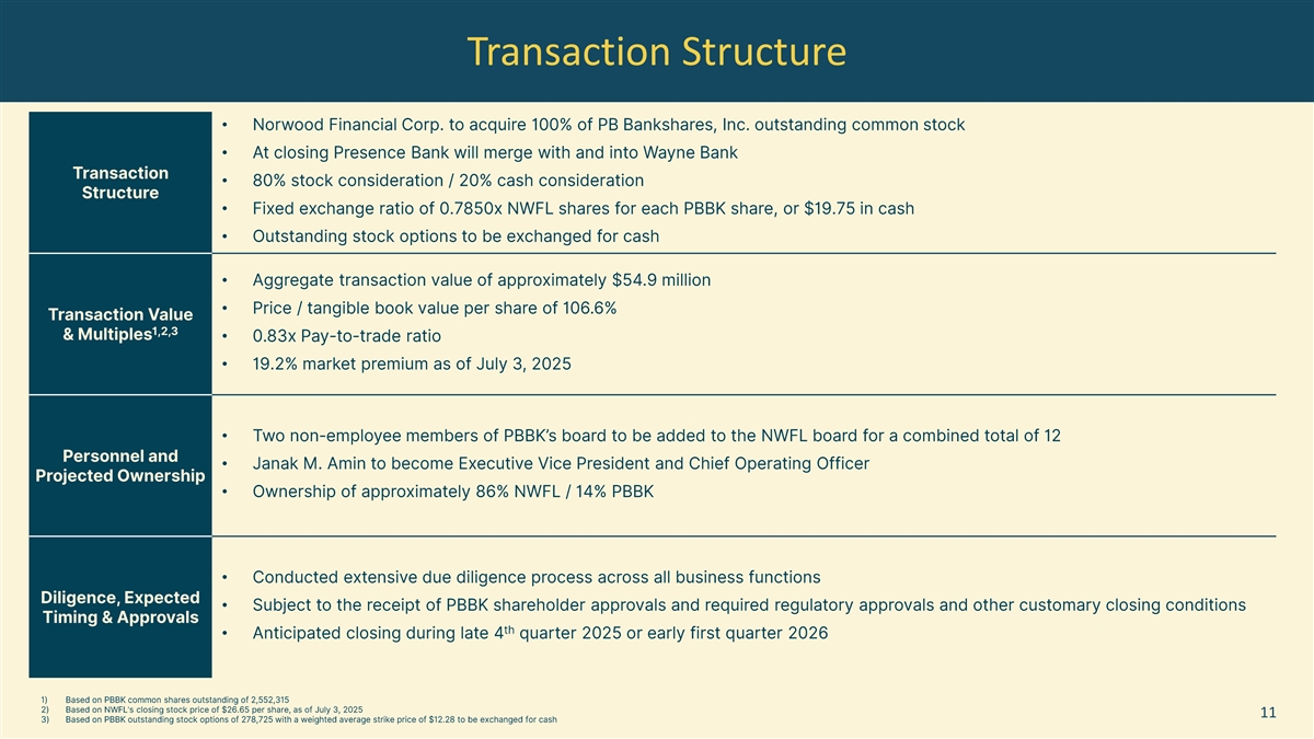 Under the terms of the merger agreement, 80% of Presence’s common shares will be converted into Norwood Financial common stock while the remaining 20% will be exchanged for cash. Presence’s shareholders will have the option to elect to receive either 0.7850 shares of Norwood Financial common stock or $19.75 in cash for each common share of Presence they own. The election is subject to proration to ensure that, in the aggregate, 80% of the transaction consideration will be paid in the form of Norwood Financial common stock. All options to purchase Presence’s common stock will be cashed out upon completion of the merger. Based on the closing price $26.65 for Norwood Financial Common Stock on July 3, 2025, the transaction would have an aggregate value of approximately $54.9 million. The purchase price reflects a multiple of 106.6% of Presence’s March 31, 2025, tangible book value and a 2.3% core deposit premium. Following completion of the transaction, Presence shareholders who elect to receive common stock share consideration will receive a quarterly cash dividend equal to approximately $0.24 per Norwood Financial share of common stock based on Norwood Financial’s current quarterly dividend of $0.31 per share of common stock. This dividend reflects a yield of 3.6% based on Norwood Financial’s closing price of $26.65 on July 3, 2025.