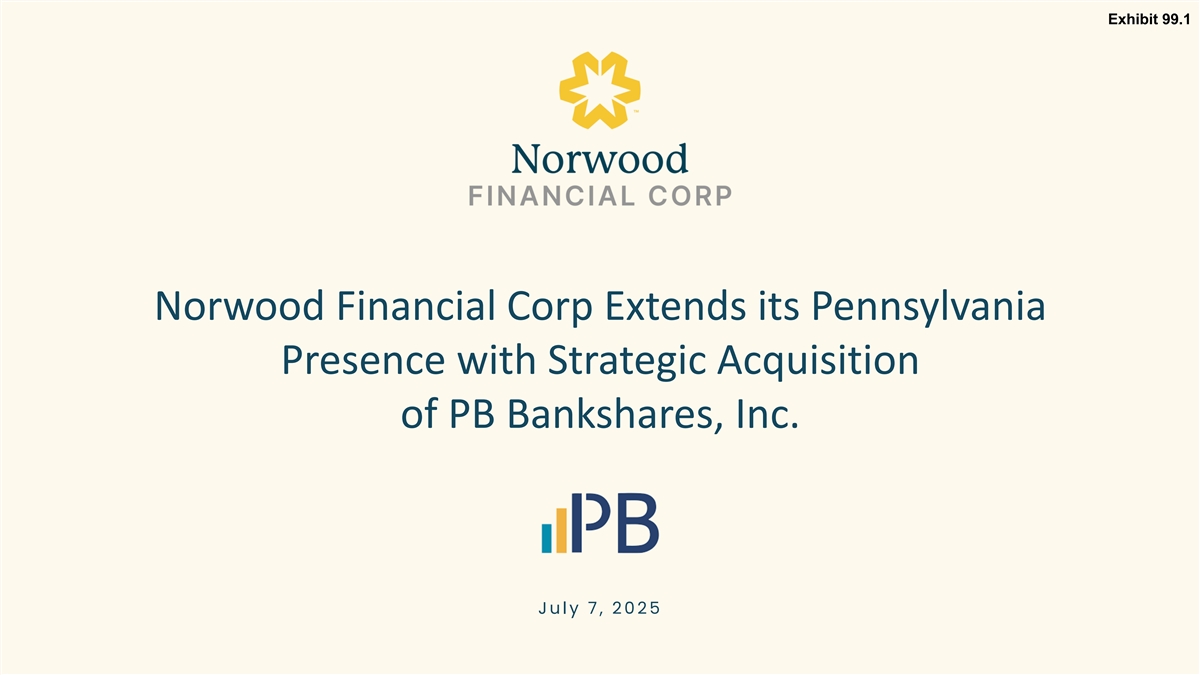 Exhibit 99.1 Norwood Financial Corp Extends its Pennsylvania Presence with Strategic Acquisition of PB Bankshares, Inc. J u l y 7 , 2 0 2 5