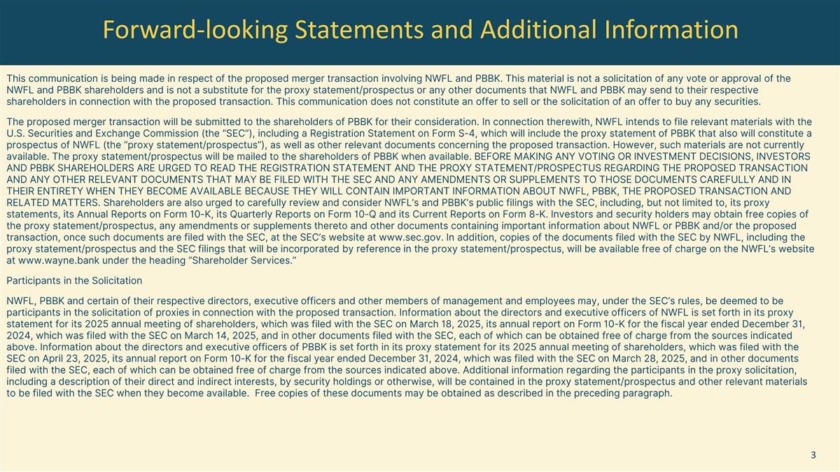 Norwood Financial is the bank holding company for Wayne Bank, which operates 30 banking offices in Pennsylvania and New York. As of March 31, 2025, Norwood Financial had consolidated assets of $2.4 billion. Presence is the bank holding company for Presence Bank, which operates four banking offices, one loan production office and one administration office in Central and Southeastern Pennsylvania. Presence had assets of $467 million as of March 31, 2025. In connection with the merger of the holding companies, Presence’s subsidiary, Presence Bank, will be merged into Wayne Bank. The combined company will have approximately $3.0 billion in assets and will be a premier Pennsylvania community bank operating in Northeastern, Central and Southeastern Pennsylvania.