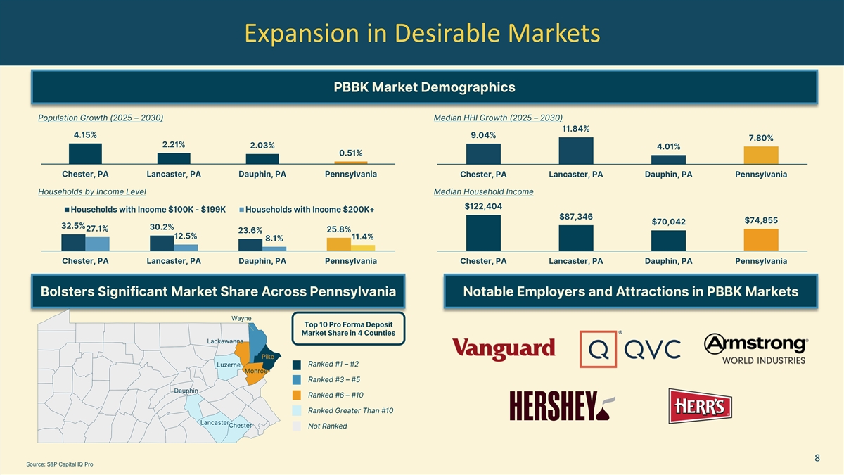 Transformative Geographical Expansion The acquisition of PBBK provides Norwood with a strategic foothold in desirable Central and Southeastern Pennsylvania markets. In addition to PBBK’s brick and mortar footprint, the company will provide Norwood with a talented lending team with key commercial relationships in competitive markets. Norwood’s larger platform will provide existing PBBK bankers with the leverage to service larger clients. The pro forma bank will be adequately positioned to expand in the acquired markets. NWFL is a comprehensive financial services platform with 30 offices across Pennsylvania and New York. The company has been a symbol of strength, safety and security for the communities, customers and stockholders they serve for over 150 years. NWFL looks forward to supporting PBBK and providing white glove service to new and existing clients in Central and Southeastern Pennsylvania. 7