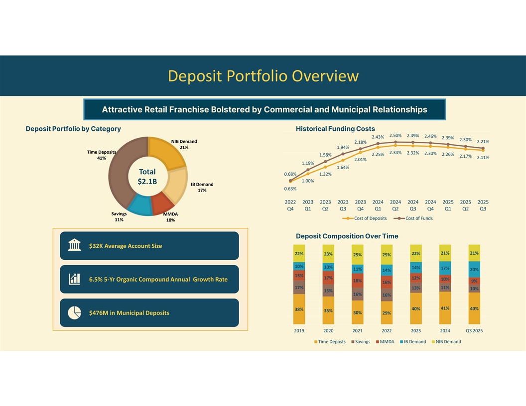 Deposit Portfolio Overview Attractive Retail Franchise Bolstered by Commercial and Municipal Relationships Deposit Portfolio by Category Historical Funding Costs 2.50% 2.49% 2.46% 2.43% 2.39% 2.30% NIB Demand 2.21% 2.18% 21% 1.94% Time Deposits 2.34% 2.32% 2.30% 2.25% 2.26% 1.58% 2.17% 2.11% 41% 2.01% 1.19% 1.64% Total 0.68% 1.32% 1.00% $2.1B IB Demand 0.63% 17% 2022 2023 2023 2023 2023 2024 2024 2024 2024 2025 2025 2025 Q4 Q1 Q2 Q3 Q4 Q1 Q2 Q3 Q4 Q1 Q2 Q3 Savings MMDA Cost of Deposits Cost of Funds 11% 10% Deposit Composition Over Time $32K Average Account Size 21% 21% 22% 23% 22% 25% 25% 10% 10% 14% 17% 11% 20% 14% 13% 17% 12% 10% 6.5% 5-Yr Organic Compound Annual Growth Rate 18% 9% 16% 17% 13% 11% 10% 15% 16% 16% 41% 40% 40% 38% 35% 30% 29% $476M in Municipal Deposits 2019 2020 2021 2022 2023 2024 Q3 2025 Time Deposts Savings MMDA IB Demand NIB Demand