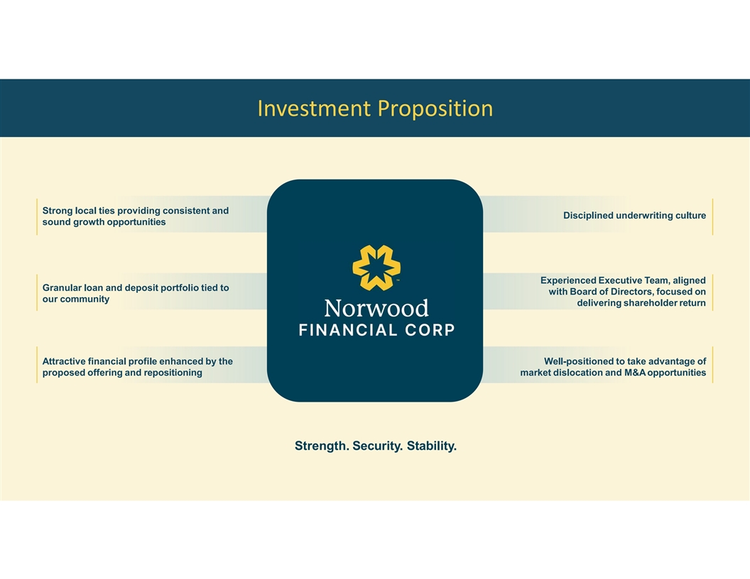 Investment Proposition Strong local ties providing consistent and Disciplined underwriting culture sound growth opportunities Experienced Executive Team, aligned Granular loan and deposit portfolio tied to with Board of Directors, focused on our community delivering shareholder return Attractive financial profile enhanced by the Well-positioned to take advantage of proposed offering and repositioning market dislocation and M&Aopportunities Strength. Security. Stability.
