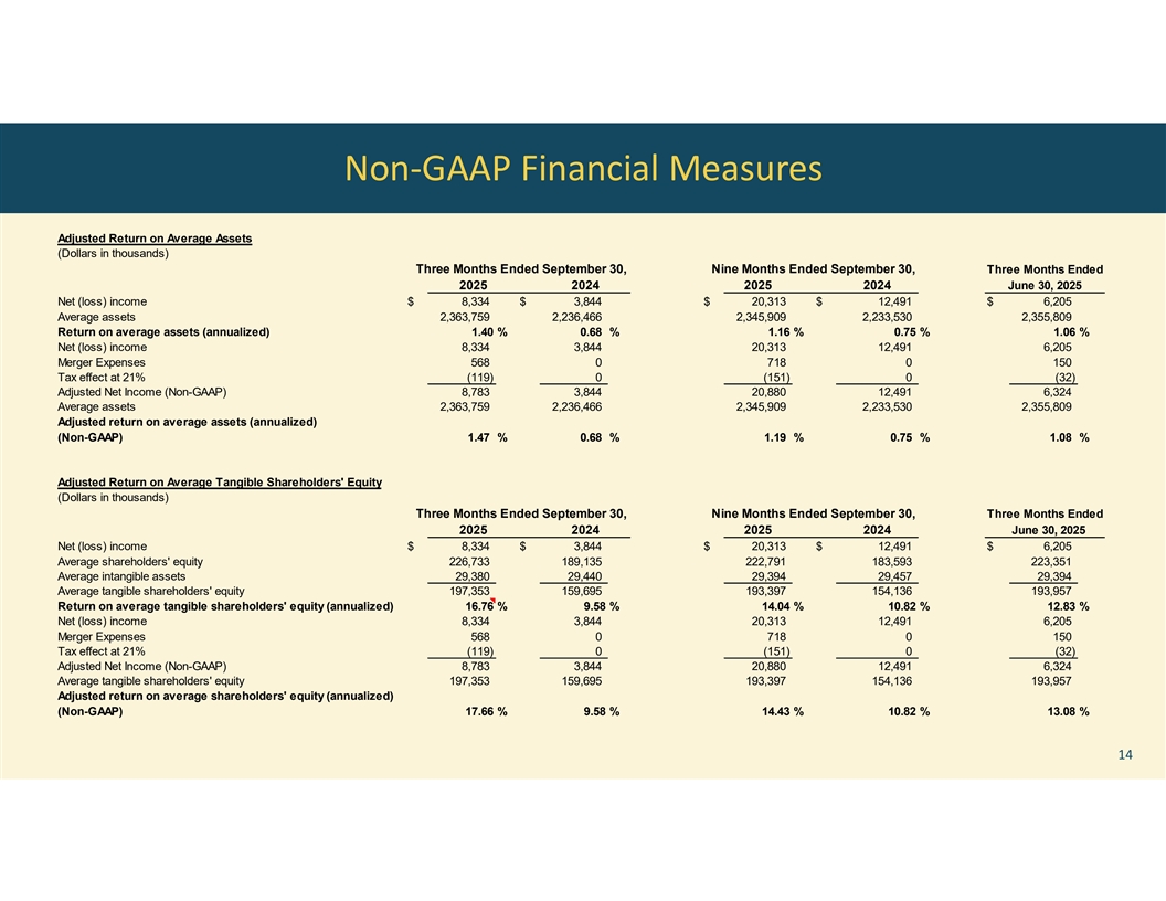 Non-GAAP Financial Measures Adjusted Return on Average Assets (Dollars in thousands) Three Months Ended September 30, Nine Months Ended September 30, Three Months Ended 2025 2024 2025 2024 June 30, 2025 Net (loss) income $ 8,334 $ 3,844 $ 20,313 $ 12,491 $ 6,205 Average assets 2,363,759 2,236,466 2,345,909 2,233,530 2,355,809 Return on average assets (annualized) 1.40 % 0.68 % 1.16 % 0.75 % 1.06 % Net (loss) income 8,334 3,844 20,313 12,491 6,205 Merger Expenses 568 0 718 0 150 Tax effect at 21% (119) 0 (151) 0 (32) Adjusted Net Income (Non-GAAP) 8,783 3,844 20,880 12,491 6,324 Average assets 2,363,759 2,236,466 2,345,909 2,233,530 2,355,809 Adjusted return on average assets (annualized) (Non-GAAP) 1.47 % 0.68 % 1.19 % 0.75 % 1.08 % Adjusted Return on Average Tangible Shareholders' Equity (Dollars in thousands) Three Months Ended September 30, Nine Months Ended September 30, Three Months Ended 2025 2024 2025 2024 June 30, 2025 Net (loss) income $ 8,334 $ 3,844 $ 20,313 $ 12,491 $ 6,205 Average shareholders' equity 226,733 189,135 222,791 183,593 223,351 Average intangible assets 29,380 29,440 29,394 29,457 29,394 Average tangible shareholders' equity 197,353 159,695 193,397 154,136 193,957 Return on average tangible shareholders' equity (annualized) 16.76 % 9.58 % 14.04 % 10.82 % 12.83 % Net (loss) income 8,334 3,844 20,313 12,491 6,205 Merger Expenses 568 0 718 0 150 Tax effect at 21% (119) 0 (151) 0 (32) Adjusted Net Income (Non-GAAP) 8,783 3,844 20,880 12,491 6,324 Average tangible shareholders' equity 197,353 159,695 193,397 154,136 193,957 Adjusted return on average shareholders' equity (annualized) (Non-GAAP) 17.66 % 9.58 % 14.43 % 10.82 % 13.08 % 14