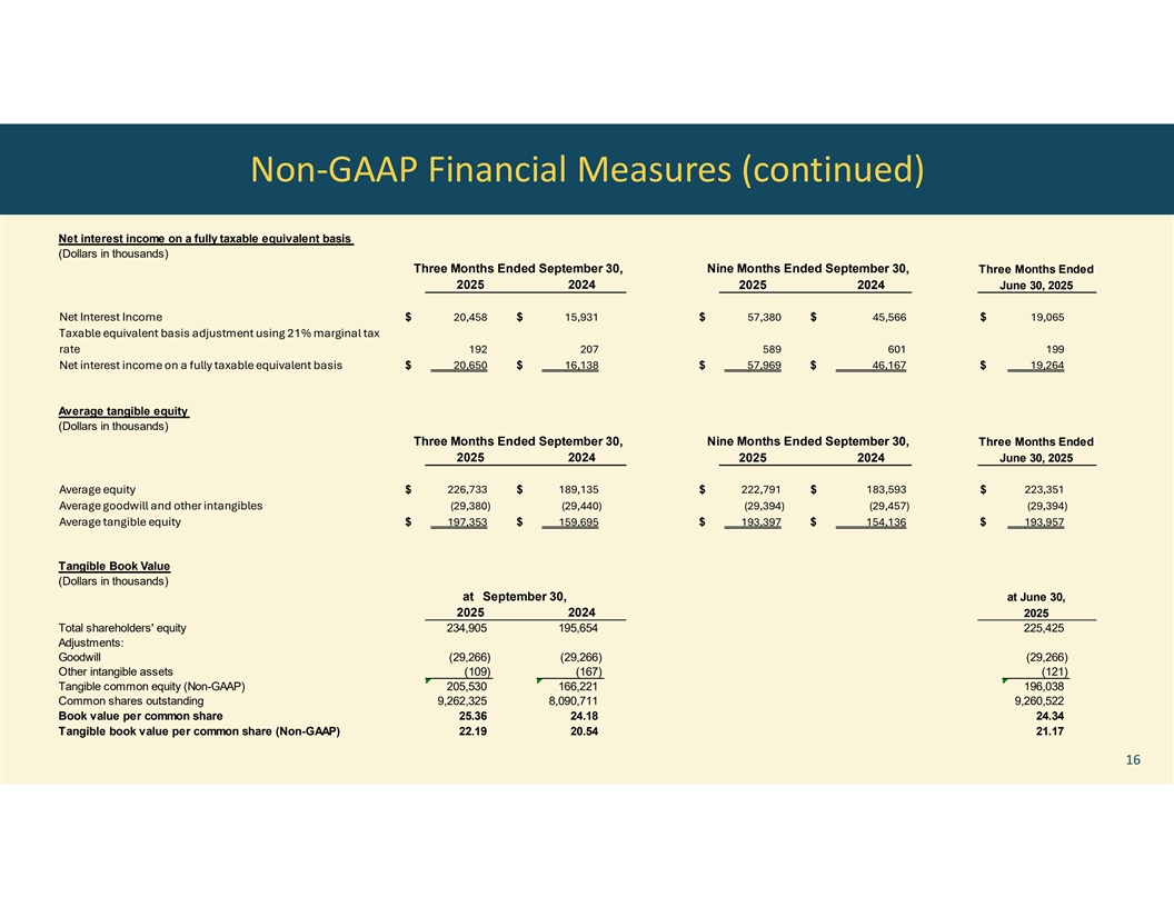 Non-GAAP Financial Measures (continued) Net interest income on a fully taxable equivalent basis (Dollars in thousands) Three Months Ended September 30, Nine Months Ended September 30, Three Months Ended 2025 2024 2025 2024 June 30, 2025 Net Interest Income $ 20,458 $ 15,931 $ 5 7,380 $ 4 5,566 $ 19,065 Taxable equivalent basis adjustment using 21% marginal tax rate 192 207 589 601 199 Net interest income on a fully taxable equivalent basis $ 2 0,650 $ 1 6,138 $ 5 7,969 $ 46,167 $ 1 9,264 Average tangible equity (Dollars in thousands) Three Months Ended September 30, Nine Months Ended September 30, Three Months Ended 2025 2024 2025 2024 June 30, 2025 Average equity $ 226,733 $ 189,135 $ 222,791 $ 183,593 $ 223,351 Average goodwill and other intangibles (29,380) (29,440) (29,394) (29,457) (29,394) Average tangible equity $ 197,353 $ 159,695 $ 193,397 $ 154,136 $ 193,957 Tangible Book Value (Dollars in thousands) at September 30, at June 30, 2025 2024 2025 Total shareholders' equity 234,905 195,654 225,425 Adjustments: Goodwill (29,266) (29,266) (29,266) Other intangible assets (109) (167) (121) Tangible common equity (Non-GAAP) 205,530 166,221 196,038 Common shares outstanding 9,262,325 8,090,711 9,260,522 Book value per common share 25.36 24.18 24.34 Tangible book value per common share (Non-GAAP) 22.19 20.54 21.17 16