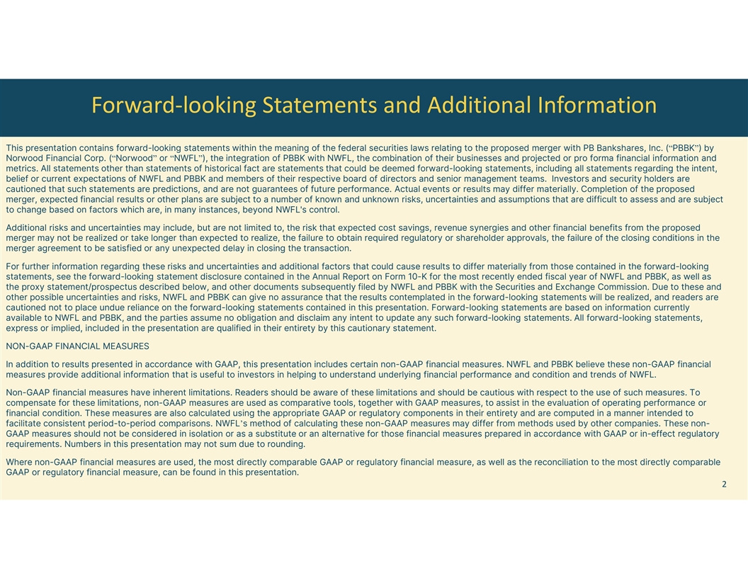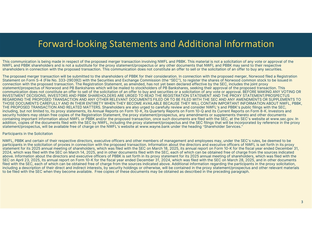Forward-looking Statements and Additional Information This presentation contains forward-looking statements within the meaning of the federal securities laws relating to the proposed merger with PB Bankshares, Inc. (“PBBK”) by Norwood Financial Corp. (“Norwood” or “NWFL”), the integration of PBBK with NWFL, the combination of their businesses and projected or pro forma financial information and metrics. All statements other than statements of historical fact are statements that could be deemed forward-looking statements, including all statements regarding the intent, belief or current expectations of NWFL and PBBK and members of their respective board of directors and senior management teams. Investors and security holders are cautioned that such statements are predictions, and are not guarantees of future performance. Actual events or results may differ materially. Completion of the proposed merger, expected financial results or other plans are subject to a number of known and unknown risks, uncertainties and assumptions that are difficult to assess and are subject to change based on factors which are, in many instances, beyond NWFL's control. Additional risks and uncertainties may include, but are not limited to, the risk that expected cost savings, revenue synergies and other financial benefits from the proposed merger may not be realized or take longer than expected to realize, the failure to obtain required regulatory or shareholder approvals, the failure of the closing conditions in the merger agreement to be satisfied or any unexpected delay in closing the transaction. For further information regarding these risks and uncertainties and additional factors that could cause results to differ materially from those contained in the forward-looking statements, see the forward-looking statement disclosure contained in the Annual Report on Form 10-K for the most recently ended fiscal year of NWFL and PBBK, as well as the proxy statement/prospectus described below, and other documents subsequently filed by NWFL and PBBK with the Securities and Exchange Commission. Due to these and other possible uncertainties and risks, NWFL and PBBK can give no assurance that the results contemplated in the forward-looking statements will be realized, and readers are cautioned not to place undue reliance on the forward-looking statements contained in this presentation. Forward-looking statements are based on information currently available to NWFL and PBBK, and the parties assume no obligation and disclaim any intent to update any such forward-looking statements. All forward-looking statements, express or implied, included in the presentation are qualified in their entirety by this cautionary statement. NON-GAAP FINANCIAL MEASURES In addition to results presented in accordance with GAAP, this presentation includes certain non-GAAP financial measures. NWFL and PBBK believe these non-GAAP financial measures provide additional information that is useful to investors in helping to understand underlying financial performance and condition and trends of NWFL. Non-GAAP financial measures have inherent limitations. Readers should be aware of these limitations and should be cautious with respect to the use of such measures. To compensate for these limitations, non-GAAP measures are used as comparative tools, together with GAAP measures, to assist in the evaluation of operating performance or financial condition. These measures are also calculated using the appropriate GAAP or regulatory components in their entirety and are computed in a manner intended to facilitate consistent period-to-period comparisons. NWFL’s method of calculating these non-GAAP measures may differ from methods used by other companies. These non- GAAP measures should not be considered in isolation or as a substitute or an alternative for those financial measures prepared in accordance with GAAP or in-effect regulatory requirements. Numbers in this presentation may not sum due to rounding. Where non-GAAP financial measures are used, the most directly comparable GAAP or regulatory financial measure, as well as the reconciliation to the most directly comparable GAAP or regulatory financial measure, can be found in this presentation. 2