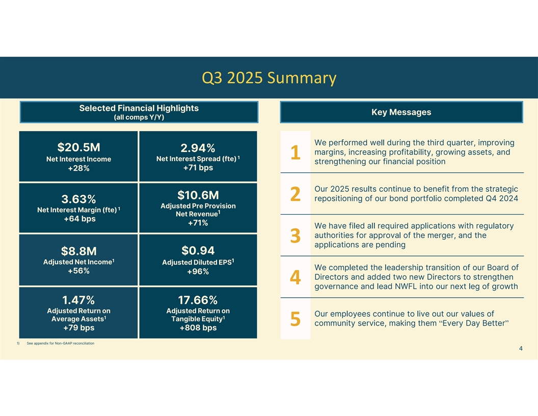 Q3 2025 Summary Selected Financial Highlights Key Messages (all comps Y/Y) We performed well during the third quarter, improving $20.5M 2.94% margins, increasing profitability, growing assets, and 1 1 Net Interest Spread (fte) Net Interest Income strengthening our financial position +71 bps +28% Our 2025 results continue to benefit from the strategic $10.6M 2 repositioning of our bond portfolio completed Q4 2024 3.63% Adjusted Pre Provision 1 Net Interest Margin (fte) 1 Net Revenue +64 bps +71% We have filed all required applications with regulatory authorities for approval of the merger, and the 3 applications are pending $0.94 $8.8M 1 1 Adjusted Net Income Adjusted Diluted EPS We completed the leadership transition of our Board of +56% +96% Directors and added two new Directors to strengthen 4 governance and lead NWFL into our next leg of growth 1.47% 17.66% Adjusted Return on Adjusted Return on Our employees continue to live out our values of 1 1 Average Assets Tangible Equity 5 community service, making them “Every Day Better” +79 bps +808 bps 1) See appendix for Non-GAAP reconciliation 4