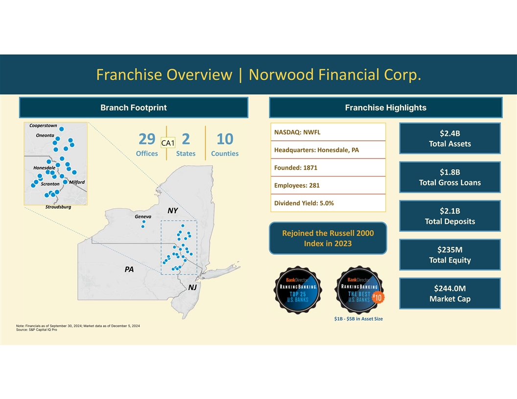 Franchise Overview | Norwood Financial Corp. Branch Footprint Franchise Highlights Cooperstown NASDAQ: NWFL $2.4B Oneonta 29 2 10 CA1 Total Assets Headquarters: Honesdale, PA Offices States Counties Honesdale Founded: 1871 $1.8B Milford Total Gross Loans Scranton Employees: 281 Dividend Yield: 5.0% Stroudsburg NY $2.1B Geneva Total Deposits Rejoined the Russell 2000 Index in 2023 $235M Total Equity PA NJ $244.0M Market Cap $1B - $5B in Asset Size Note: Financials as of September 30, 2024; Market data as of December 5, 2024 Source: S&P Capital IQ Pro