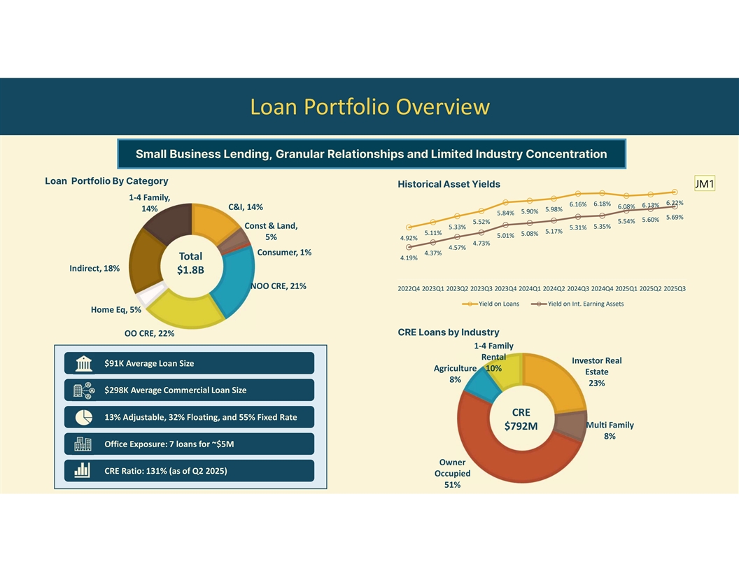 Loan Portfolio Overview Small Business Lending, Granular Relationships and Limited Industry Concentration Loan Portfolio By Category Historical Asset Yields JM1 1-4 Family, 6.22% 6.18% 6.16% 6.13% 6.08% C&I, 14% 14% 5.98% 5.90% 5.84% 5.69% 5.60% 5.52% 5.54% Const & Land, 5.35% 5.33% 5.31% 5.17% 5.11% 5.08% 5.01% 5% 4.92% 4.73% 4.57% Consumer, 1% 4.37% Total 4.19% Indirect, 18% $1.8B NOO CRE, 21% 2022Q4 2023Q1 2023Q2 2023Q3 2023Q4 2024Q1 2024Q2 2024Q3 2024Q4 2025Q1 2025Q2 2025Q3 Yield on Loans Yield on Int. Earning Assets Home Eq, 5% CRE Loans by Industry OO CRE, 22% 1-4 Family Rental Investor Real $91K Average Loan Size Agriculture 10% Estate 8% 23% $298K Average Commercial Loan Size CRE 13% Adjustable, 32% Floating, and 55% Fixed Rate Multi Family $792M 8% Office Exposure: 7 loans for ~$5M Owner CRE Ratio: 131% (as of Q2 2025) Occupied 51%