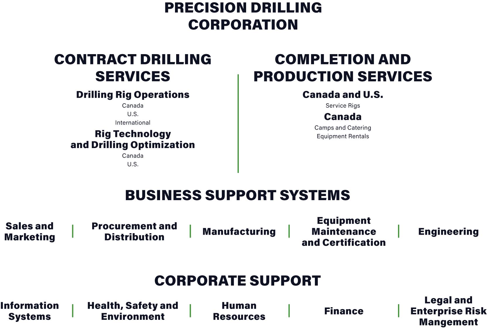 Precision Drilling Corporation Contract Drilling Services Drilling Rig Operations Canada U.S. International Directional Drilling Operations Canada Completion and Production Services Canada and U.S. Service Rigs Canada Camps and Catering Equipment Rentals Business Support Systems Sales and Marketing Procurement and Distribution Manufacturing Equipment Maintenance and Certification Engineering Corporate Support Information Systems Health, Safety and Environment Human Resources Finance Legal and Enterprise Risk Management