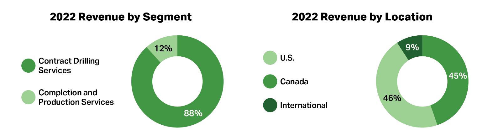 We provide onshore drilling services to exploration and production companies in the oil and natural gas and geothermal industries, operating in Canada, the U.S., and internationally. In Canada, we are the largest onshore drilling company, servicing approximately 32% of the active land drilling market. In the U.S. we are one of the largest onshore drilling companies, servicing approximately 8% of the active land drilling market. We also have an international presence with operations in the Middle East.