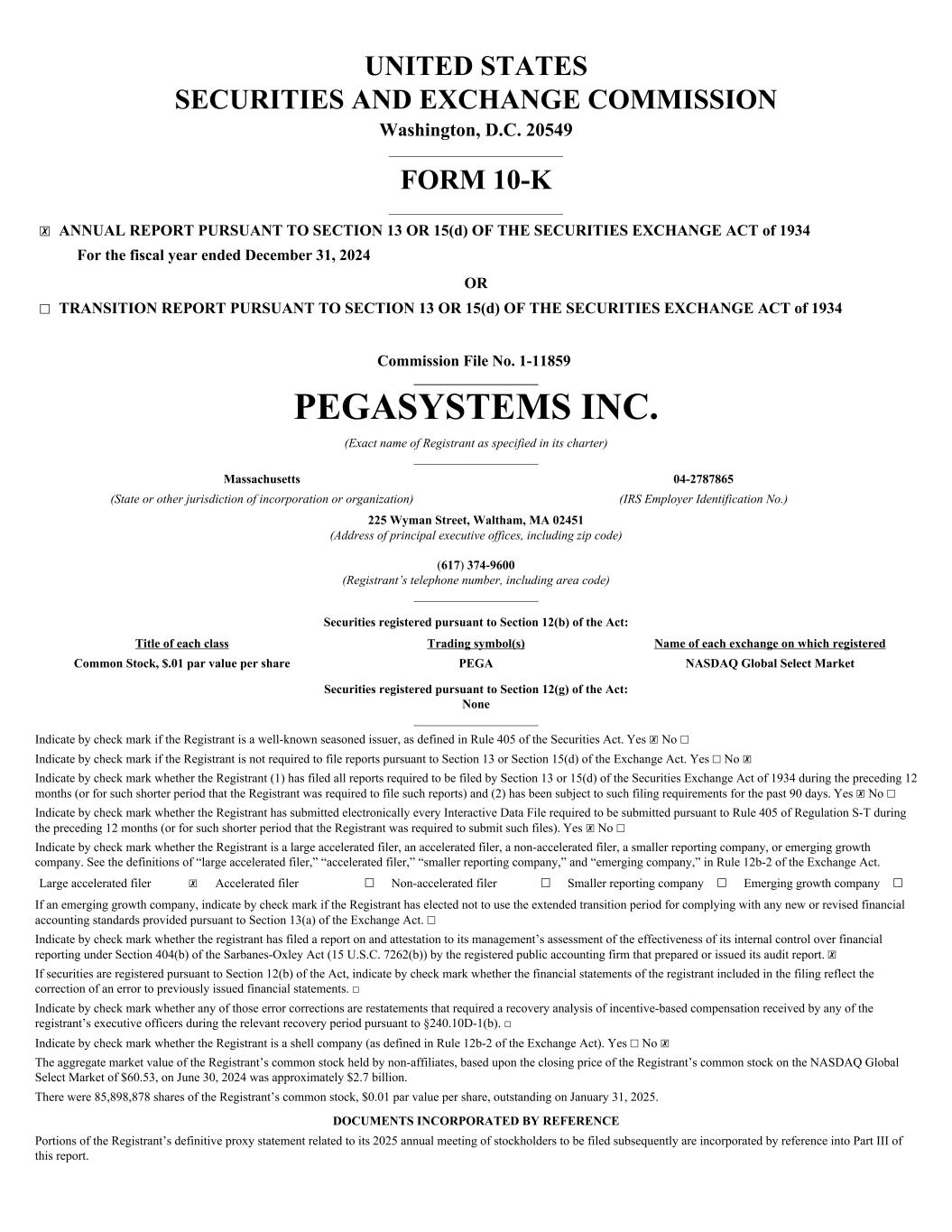 UNITED STATES SECURITIES AND EXCHANGE COMMISSION Washington, D.C. 20549 ____________________________ FORM 10-K ____________________________ ☒ ANNUAL REPORT PURSUANT TO SECTION 13 OR 15(d) OF THE SECURITIES EXCHANGE ACT of 1934 For the fiscal year ended December 31, 2024 OR ☐ TRANSITION REPORT PURSUANT TO SECTION 13 OR 15(d) OF THE SECURITIES EXCHANGE ACT of 1934 Commission File No. 1-11859 ____________________ PEGASYSTEMS INC. (Exact name of Registrant as specified in its charter) ____________________ Massachusetts 04-2787865 (State or other jurisdiction of incorporation or organization) (IRS Employer Identification No.) 225 Wyman Street, Waltham, MA 02451 (Address of principal executive offices, including zip code) (617) 374-9600 (Registrant’s telephone number, including area code) ____________________ Securities registered pursuant to Section 12(b) of the Act: Title of each class Trading symbol(s) Name of each exchange on which registered Common Stock, $.01 par value per share PEGA NASDAQ Global Select Market Securities registered pursuant to Section 12(g) of the Act: None ____________________ Indicate by check mark if the Registrant is a well-known seasoned issuer, as defined in Rule 405 of the Securities Act. Yes ☒ No ☐ Indicate by check mark if the Registrant is not required to file reports pursuant to Section 13 or Section 15(d) of the Exchange Act. Yes ☐ No ☒ Indicate by check mark whether the Registrant (1) has filed all reports required to be filed by Section 13 or 15(d) of the Securities Exchange Act of 1934 during the preceding 12 months (or for such shorter period that the Registrant was required to file such reports) and (2) has been subject to such filing requirements for the past 90 days. Yes ☒ No ☐ Indicate by check mark whether the Registrant has submitted electronically every Interactive Data File required to be submitted pursuant to Rule 405 of Regulation S-T during the preceding 12 months (or for such shorter period that the Registrant was required to submit such files). Yes ☒ No ☐ Indicate by check mark whether the Registrant is a large accelerated filer, an accelerated filer, a non-accelerated filer, a smaller reporting company, or emerging growth company. See the definitions of “large accelerated filer,” “accelerated filer,” “smaller reporting company,” and “emerging company,” in Rule 12b-2 of the Exchange Act. Large accelerated filer ☒ Accelerated filer ☐ Non-accelerated filer ☐ Smaller reporting company ☐ Emerging growth company ☐ If an emerging growth company, indicate by check mark if the Registrant has elected not to use the extended transition period for complying with any new or revised financial accounting standards provided pursuant to Section 13(a) of the Exchange Act. ☐ Indicate by check mark whether the registrant has filed a report on and attestation to its management’s assessment of the effectiveness of its internal control over financial reporting under Section 404(b) of the Sarbanes-Oxley Act (15 U.S.C. 7262(b)) by the registered public accounting firm that prepared or issued its audit report. ☒ If securities are registered pursuant to Section 12(b) of the Act, indicate by check mark whether the financial statements of the registrant included in the filing reflect the correction of an error to previously issued financial statements. □ Indicate by check mark whether any of those error corrections are restatements that required a recovery analysis of incentive-based compensation received by any of the registrant’s executive officers during the relevant recovery period pursuant to §240.10D-1(b). □ Indicate by check mark whether the Registrant is a shell company (as defined in Rule 12b-2 of the Exchange Act). Yes ☐ No ☒ The aggregate market value of the Registrant’s common stock held by non-affiliates, based upon the closing price of the Registrant’s common stock on the NASDAQ Global Select Market of $60.53, on June 30, 2024 was approximately $2.7 billion. There were 85,898,878 shares of the Registrant’s common stock, $0.01 par value per share, outstanding on January 31, 2025. DOCUMENTS INCORPORATED BY REFERENCE Portions of the Registrant’s definitive proxy statement related to its 2025 annual meeting of stockholders to be filed subsequently are incorporated by reference into Part III of this report.