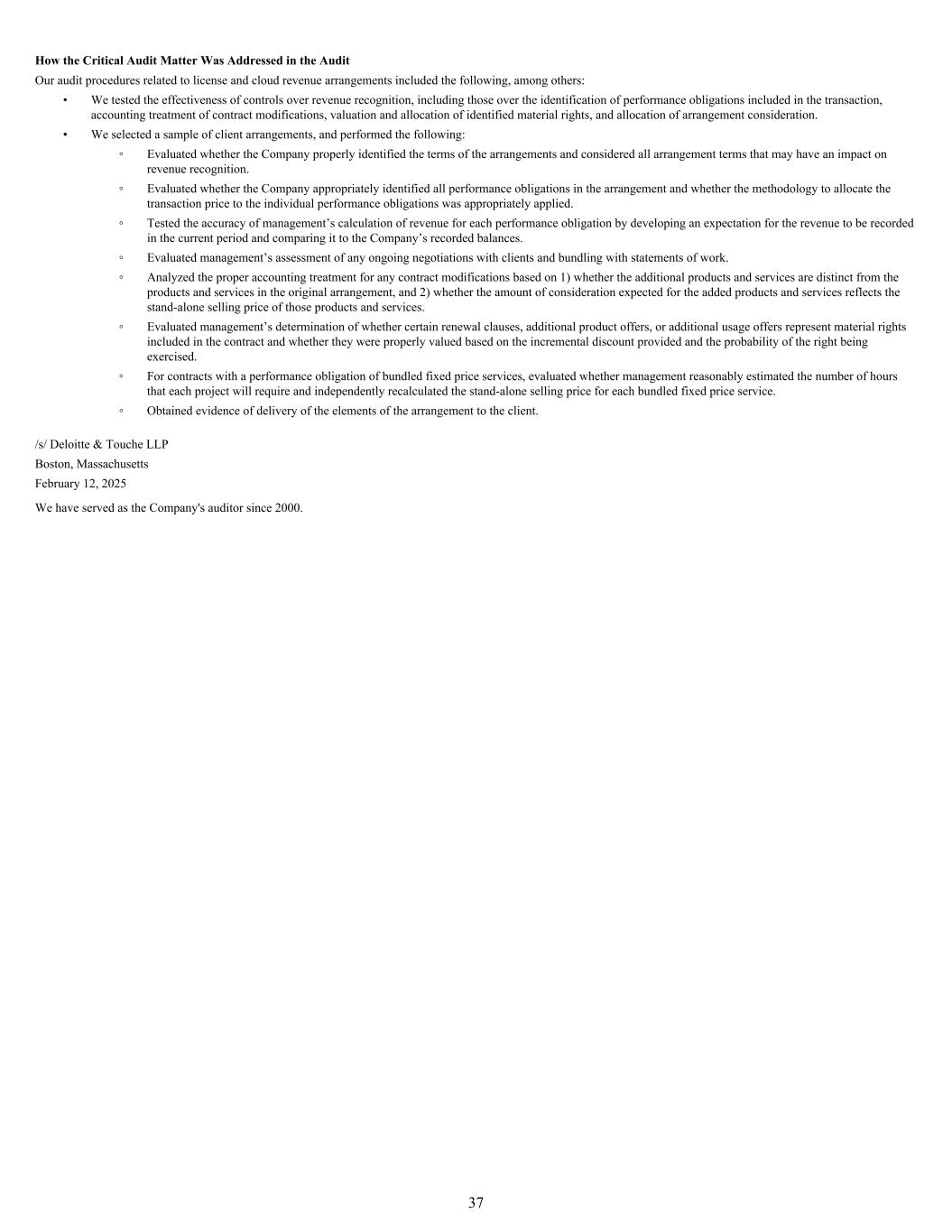 How the Critical Audit Matter Was Addressed in the Audit Our audit procedures related to license and cloud revenue arrangements included the following, among others: • We tested the effectiveness of controls over revenue recognition, including those over the identification of performance obligations included in the transaction, accounting treatment of contract modifications, valuation and allocation of identified material rights, and allocation of arrangement consideration. • We selected a sample of client arrangements, and performed the following: ◦ Evaluated whether the Company properly identified the terms of the arrangements and considered all arrangement terms that may have an impact on revenue recognition. ◦ Evaluated whether the Company appropriately identified all performance obligations in the arrangement and whether the methodology to allocate the transaction price to the individual performance obligations was appropriately applied. ◦ Tested the accuracy of management’s calculation of revenue for each performance obligation by developing an expectation for the revenue to be recorded in the current period and comparing it to the Company’s recorded balances. ◦ Evaluated management’s assessment of any ongoing negotiations with clients and bundling with statements of work. ◦ Analyzed the proper accounting treatment for any contract modifications based on 1) whether the additional products and services are distinct from the products and services in the original arrangement, and 2) whether the amount of consideration expected for the added products and services reflects the stand-alone selling price of those products and services. ◦ Evaluated management’s determination of whether certain renewal clauses, additional product offers, or additional usage offers represent material rights included in the contract and whether they were properly valued based on the incremental discount provided and the probability of the right being exercised. ◦ For contracts with a performance obligation of bundled fixed price services, evaluated whether management reasonably estimated the number of hours that each project will require and independently recalculated the stand-alone selling price for each bundled fixed price service. ◦ Obtained evidence of delivery of the elements of the arrangement to the client. /s/ Deloitte & Touche LLP Boston, Massachusetts February 12, 2025 We have served as the Company's auditor since 2000. 37