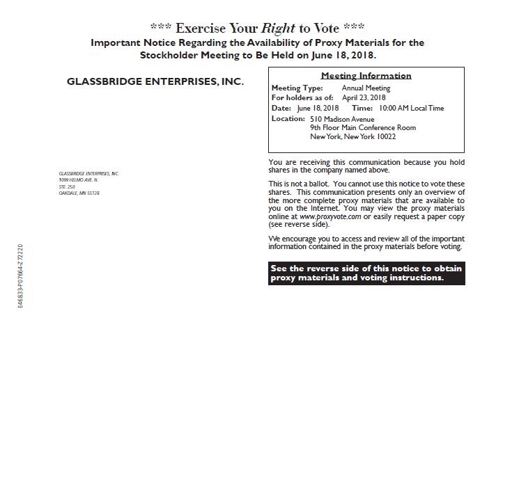 E46833-P07664-Z72220 GLASSBRIDGE ENTERPRISES, INC. 1099 HELMO AVE. N. STE. 250 OAKDALE, MN 55128 You are receiving this communication because you hold shares in the company named above. This is not a ballot. You cannot use this notice to vote these shares. This communication presents only an overview of the more complete proxy materials that are available to you on the Internet. You may view the proxy materials online at www.proxyvote.com or easily request a paper copy (see reverse side). We encourage you to access and review all of the important information contained in the proxy materials before voting. GLASSBRIDGE ENTERPRISES, INC. *** Exercise Your Right to Vote *** Important Notice Regarding the Availability of Proxy Materials for the Stockholder Meeting to Be Held on June 18, 2018. Meeting Information Meeting Type: Annual Meeting For holders as of: April 23, 2018 Date: June 18, 2018 Time: 10:00 AM Local Time Location: 510 Madison Avenue 9th Floor Main Conference Room New York, New York 10022 See the reverse side of this notice to obtain proxy materials and voting instructions.