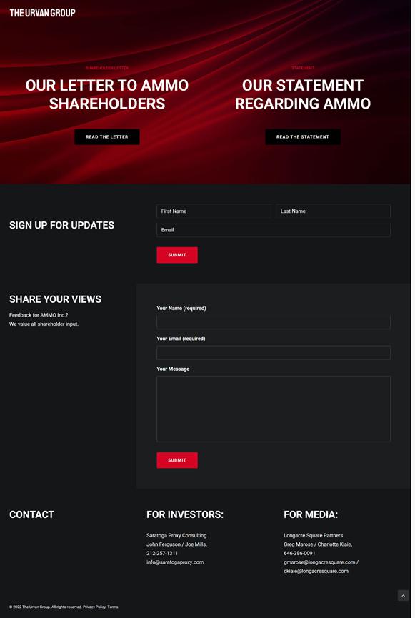 “We appreciate the positive feedback that has been proactively provided to us by our fellow shareholders. We also appreciate that the Company’s August 29th press release invited ‘all shareholders’ to articulate their views and perspectives. Given the Company’s finite resources and modest market capitalization, we hope leadership focuses on efficiently evaluating investor sentiment – not spending shareholders’ precious capital on a defensive and reactionary campaign. Likewise, we urge leadership to avoid any action or transaction that dilutes shareholders ahead of the Annual Meeting. Please trust that the Urvan Group is committed to continuing to advocate for all shareholders’ best interests and pursuing a value-enhancing transformation of AMMO in the public market.”