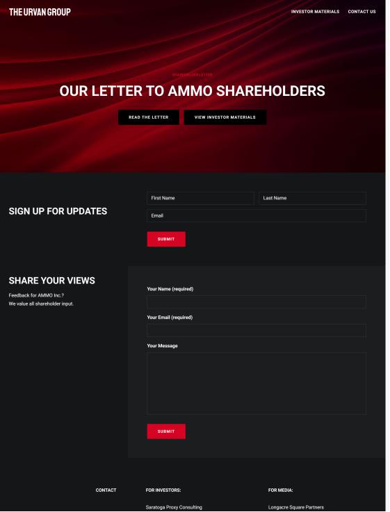 Lastly, please trust that Susan Lokey and I have always conducted ourselves with integrity and held ourselves to the highest standards while working to create value for our customers and investors. I am confident that our fellow shareholders will see through the misleading claims that were levied at us and focus on what really matters: choosing the most qualified directors to help pursue a value-enhancing transformation of AMMO. The reality is that I am investing my own time, energy and money in a campaign to strengthen the Company for the long term. I am confident my actions and ideas – not manufactured claims – will inform how shareholders view myself and the Urvan Group.”