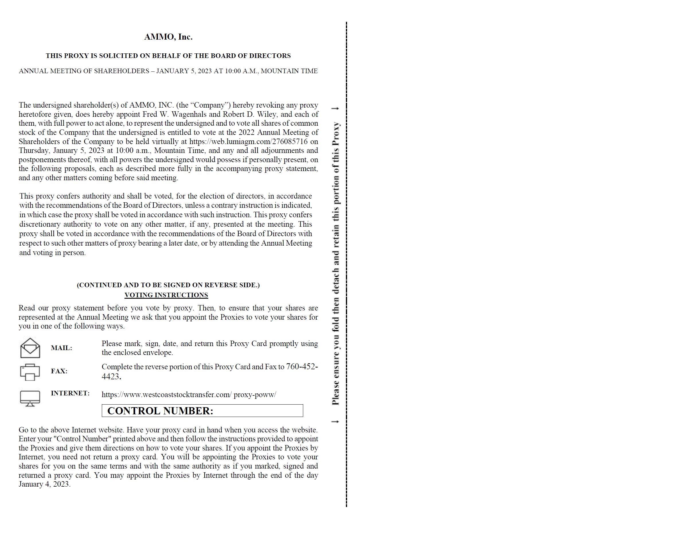 You are cordially invited to attend the 2022 Annual Meeting of Shareholders of AMMO, Inc. (the “Company”) and any adjournments, postponements or continuations thereof (the “Annual Meeting”). The Annual Meeting will be held on Thursday, January 5, 2023 virtually at https://web.lumiagm.com/276085716 at 10:00 AM Mountain Time.