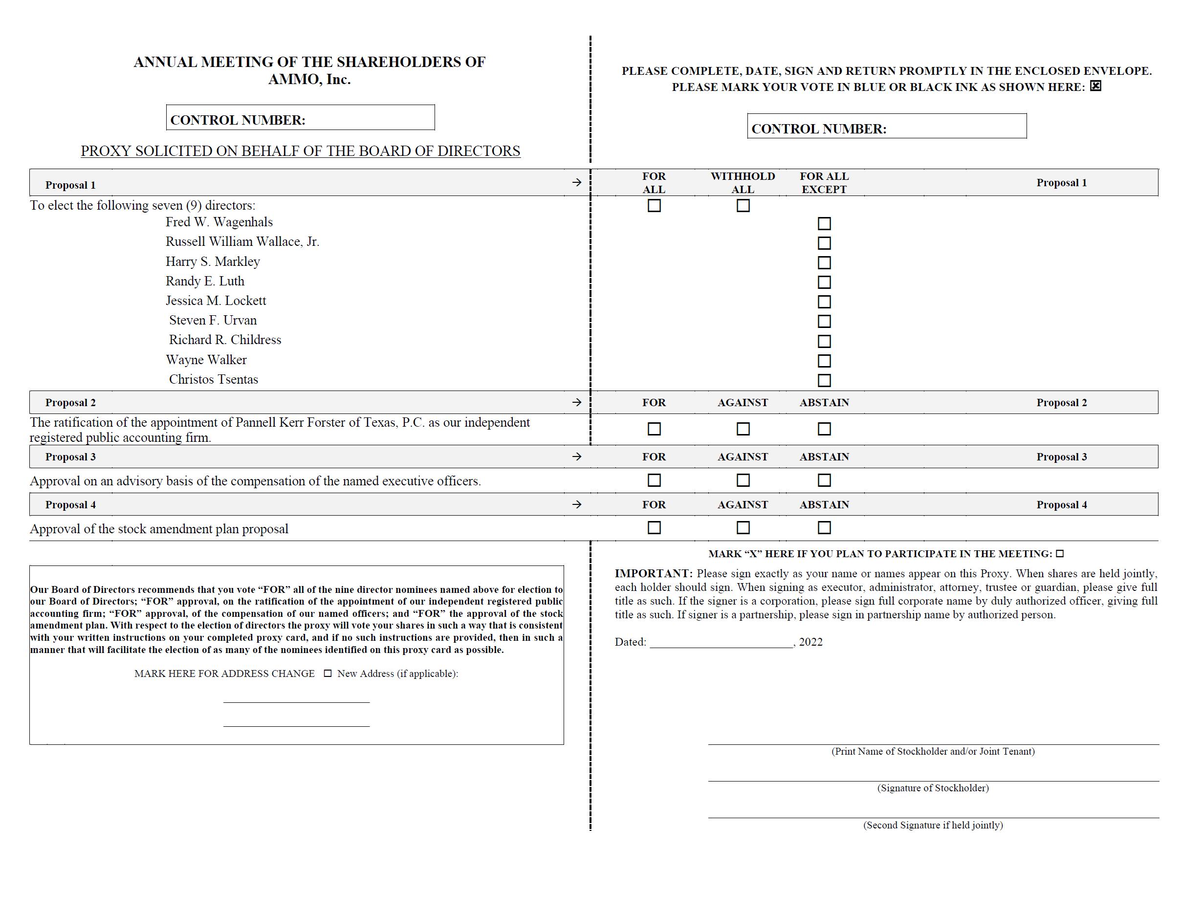 The matters to be voted on at the Annual Meeting by the holders of our common stock, par value $0.001 per share (“Common Stock”), are: (i) the election of nine (9) director nominees to our board of directors (our “Board”); (ii) the ratification of the appointment of Pannell Kerr Forster of Texas, P.C as our independent registered public accounting firm for fiscal year 2023 (the year that will end on March 31, 2023); (iii) the approval, on an advisory basis, of the compensation paid to our named executive officers, as disclosed in the proxy statement detailing the business to be conducted at the Annual Meeting; and (iv) the approval of an amendment to the Ammo, Inc. 2017 Equity Incentive Plan (the “Plan”) to increase the number of shares of Common Stock authorized for issuance under the Plan. We may also transact such other business that may properly come before the Annual Meeting. Our Board recommends that you vote in accordance with our Board’s recommendations on all proposals using the enclosed proxy card.