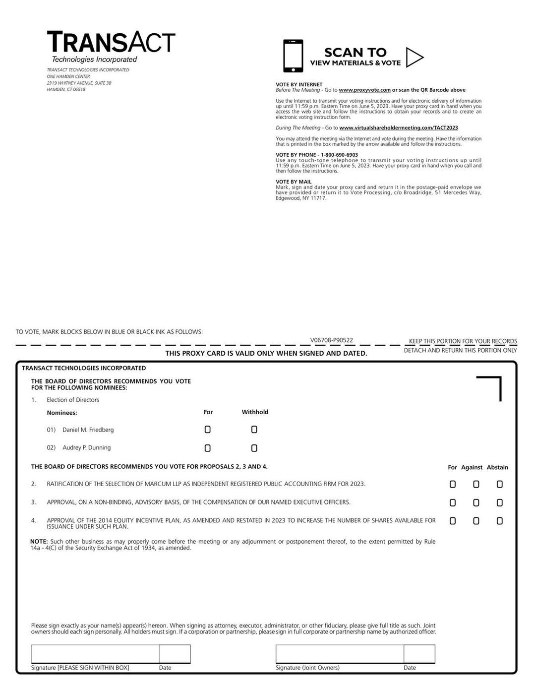 TRANSACT TECHNOLOGIES INCORPORATED ONE HAMDEN CENTER 2319 WHITNEY AVENUE, SUITE 3B HAMDEN, CT 06518 SCAN TO VIEW MATERIALS & VOTE VOTE BY INTERNET Before The Meeting - Go to www.proxyvote.com or scan the QR Barcode above Use the Internet to transmit your voting instructions and for electronic delivery of information up until 11:59 p.m. Eastern Time on June 5, 2023. Have your proxy card in hand when you access the web site and follow the instructions to obtain your records and to create an electronic voting instruction form. During The Meeting - Go to www.virtualshareholdermeeting.com/TACT2023 You may attend the meeting via the Internet and vote during the meeting. Have the information that is printed in the box marked by the arrow available and follow the instructions. VOTE BY PHONE - 1-800-690-6903 Use any touch-tone telephone to transmit your voting instructions up until 11:59 p.m. Eastern Time on June 5, 2023. Have your proxy card in hand when you call and then follow the instructions. VOTE BY MAIL Mark, sign and date your proxy card and return it in the postage-paid envelope we have provided or return it to Vote Processing, c/o Broadridge, 51 Mercedes Way, Edgewood, NY 11717. TO VOTE, MARK BLOCKS BELOW IN BLUE OR BLACK INK AS FOLLOWS: V06708-P90522 KEEP THIS PORTION FOR YOUR RECORDS THIS PROXY CARD IS VALID ONLY WHEN SIGNED AND DATED. DETACH AND RETURN THIS PORTION ONLY TRANSACT TECHNOLOGIES INCORPORATED THE BOARD OF DIRECTORS RECOMMENDS YOU VOTE FOR THE FOLLOWING NOMINEES: 1. Election of Directors Nominees: For Withhold 01) Daniel M. Friedberg 02) 02) Audrey P. Dunning THE BOARD OF DIRECTORS RECOMMENDS YOU VOTE FOR PROPOSALS 2, 3 AND 4. For Against Abstain 2. RATIFICATION OF THE SELECTION OF MARCUM LLP AS INDEPENDENT REGISTERED PUBLIC ACCOUNTING FIRM FOR 2023. 3. APPROVAL, ON A NON-BINDING, ADVISORY BASIS, OF THE COMPENSATION OF OUR NAMED EXECUTIVE OFFICERS. 4. APPROVAL OF THE 2014 EQUITY INCENTIVE PLAN, AS AMENDED AND RESTATED IN 2023 TO INCREASE THE NUMBER OF SHARES AVAILABLE FOR ISSUANCE UNDER SUCH PLAN. NOTE: Such other business as may properly come before the meeting or any adjournment or postponement thereof, to the extent permitted by Rule 14a - 4(C) of the Security Exchange Act of 1934, as amended. Please sign exactly as your name(s) appear(s) hereon. When signing as attorney, executor, administrator, or other fiduciary, please give full title as such. Joint owners should each sign personally. All holders must sign. If a corporation or partnership, please sign in full corporate or partnership name by authorized officer. Signature [PLEASE SIGN WITHIN BOX] Date Signature (Joint Owners) Date