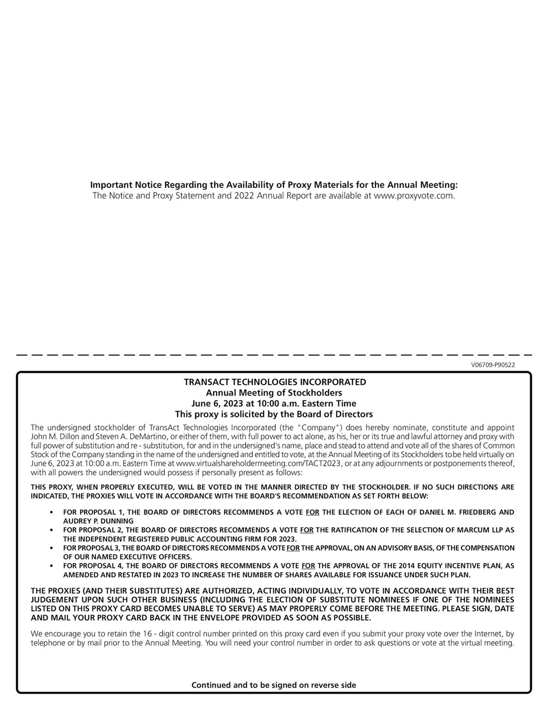 Important Notice Regarding the Availability of Proxy Materials for the Annual Meeting: The Notice and Proxy Statement and 2022 Annual Report are available at www.proxyvote.com. V06709-P90522 TRANSACT TECHNOLOGIES INCORPORATED Annual Meeting of Stockholders June 6, 2023 at 10:00 a.m. Eastern Time This proxy is solicited by the Board of Directors The undersigned stockholder of TransAct Technologies Incorporated (the “Company”) does hereby nominate, constitute and appoint John M. Dillon and Steven A. DeMartino, or either of them, with full power to act alone, as his, her or its true and lawful attorney and proxy with full power of substitution and re - substitution, for and in the undersigned’s name, place and stead to attend and vote all of the shares of Common Stock of the Company standing in the name of the undersigned and entitled to vote, at the Annual Meeting of its Stockholders to be held virtually on June 6, 2023 at 10:00 a.m. Eastern Time at www.virtualshareholdermeeting.com/TACT2023, or at any adjournments or postponements thereof, with all powers the undersigned would possess if personally present as follows: THIS PROXY, WHEN PROPERLY EXECUTED, WILL BE VOTED IN THE MANNER DIRECTED BY THE STOCKHOLDER. IF NO SUCH DIRECTIONS ARE INDICATED, THE PROXIES WILL VOTE IN ACCORDANCE WITH THE BOARD’S RECOMMENDATION AS SET FORTH BELOW: • FOR PROPOSAL 1, THE BOARD OF DIRECTORS RECOMMENDS A VOTE FOR THE ELECTION OF EACH OF DANIEL M. FRIEDBERG AND AUDREY P. DUNNING • FOR PROPOSAL 2, THE BOARD OF DIRECTORS RECOMMENDS A VOTE FOR THE RATIFICATION OF THE SELECTION OF MARCUM LLP AS THE INDEPENDENT REGISTERED PUBLIC ACCOUNTING FIRM FOR 2023. • FOR PROPOSAL 3, THE BOARD OF DIRECTORS RECOMMENDS A VOTE FOR THE APPROVAL, ON AN ADVISORY BASIS, OF THE COMPENSATION OF OUR NAMED EXECUTIVE OFFICERS. • FOR PROPOSAL 4, THE BOARD OF DIRECTORS RECOMMENDS A VOTE FOR THE APPROVAL OF THE 2014 EQUITY INCENTIVE PLAN, AS AMENDED AND RESTATED IN 2023 TO INCREASE THE NUMBER OF SHARES AVAILABLE FOR ISSUANCE UNDER SUCH PLAN. THE PROXIES (AND THEIR SUBSTITUTES) ARE AUTHORIZED, ACTING INDIVIDUALLY, TO VOTE IN ACCORDANCE WITH THEIR BEST JUDGEMENT UPON SUCH OTHER BUSINESS (INCLUDING THE ELECTION OF SUBSTITUTE NOMINEES IF ONE OF THE NOMINEES LISTED ON THIS PROXY CARD BECOMES UNABLE TO SERVE) AS MAY PROPERLY COME BEFORE THE MEETING. PLEASE SIGN, DATE AND MAIL YOUR PROXY CARD BACK IN THE ENVELOPE PROVIDED AS SOON AS POSSIBLE. We encourage you to retain the 16 - digit control number printed on this proxy card even if you submit your proxy vote over the Internet, by telephone or by mail prior to the Annual Meeting. You will need your control number in order to ask questions or vote at the virtual meeting. Continued and to be signed on reverse side
