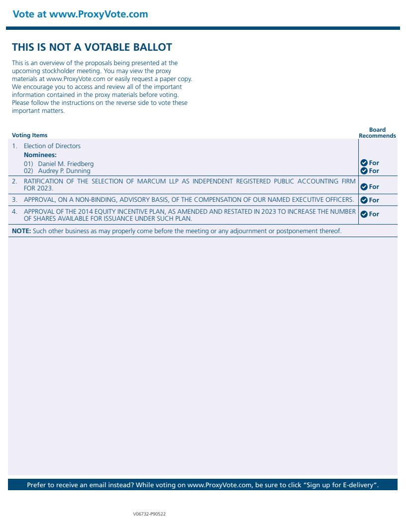 THIS IS NOT A VOTABLE BALLOTThis is an overview of the proposals being presented at the upcoming stockholder meeting. You may view the proxy materials at www.ProxyVote.com or easily request a paper copy. We encourage you to access and review all of the important information contained in the proxy materials before voting. Please follow the instructions on the reverse side to vote these important matters.Vote at www.ProxyVote.comPrefer to receive an email instead? While voting on www.ProxyVote.com, be sure to click "Sign up for E-delivery".Voting ItemsBoard RecommendsV06732-P905221. Election of Directors Nominees:ForFor3. APPROVAL, ON A NON-BINDING, ADVISORY BASIS, OF THE COMPENSATION OF OUR NAMED EXECUTIVE OFFICERS.NOTE: Such other business as may properly come before the meeting or any adjournment or postponement thereof.ForForFor01) Daniel M. Friedberg02) Audrey P. Dunning2. RATIFICATION OF THE SELECTION OF MARCUM LLP AS INDEPENDENT REGISTERED PUBLIC ACCOUNTING FIRM FOR 2023.4. APPROVAL OF THE 2014 EQUITY INCENTIVE PLAN, AS AMENDED AND RESTATED IN 2023 TO INCREASE THE NUMBER OF SHARES AVAILABLE FOR ISSUANCE UNDER SUCH PLAN.