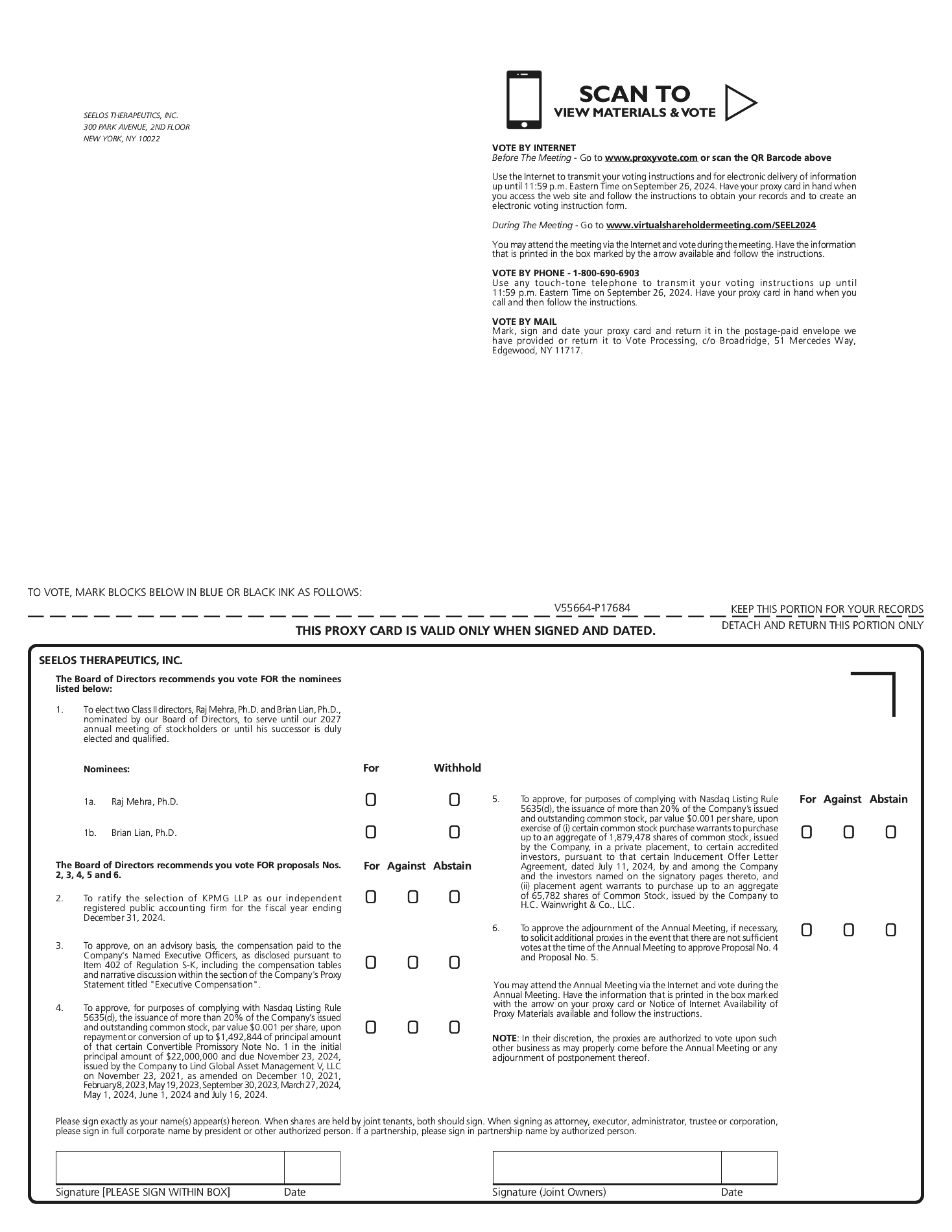 (5) | Consists of the Inducement Plan, the Seelos Therapeutics, Inc. 2016 Equity Incentive Plan and shares of Common Stock that remain available for future issuance under the ESPP. |