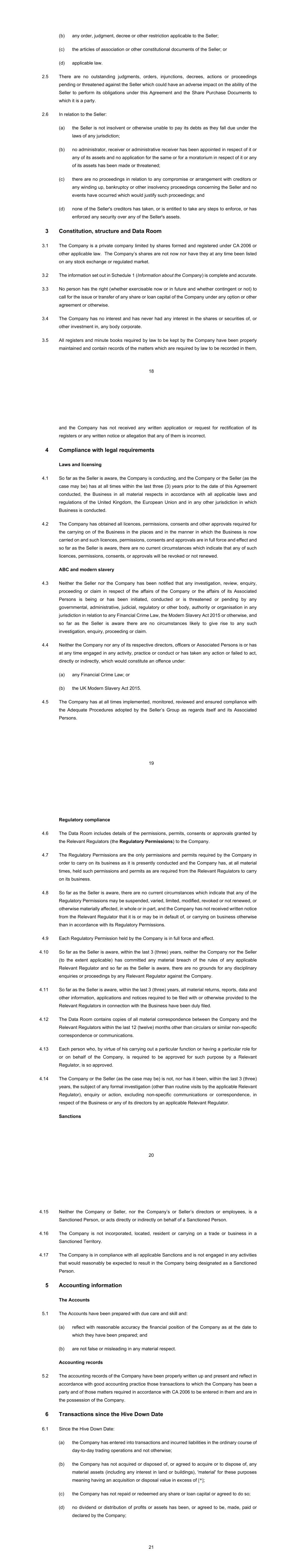 18 (b) any order, judgment, decree or other restriction applicable to the Seller; (c) the articles of association or other constitutional documents of the Seller; or (d) applicable law. 2.5 There are no outstanding judgments, orders, injunctions, decrees, actions or proceedings pending or threatened against the Seller which could have an adverse impact on the ability of the Seller to perform its obligations under this Agreement and the Share Purchase Documents to which it is a party. 2.6 In relation to the Seller: (a) the Seller is not insolvent or otherwise unable to pay its debts as they fall due under the laws of any jurisdiction; (b) no administrator, receiver or administrative receiver has been appointed in respect of it or any of its assets and no application for the same or for a moratorium in respect of it or any of its assets has been made or threatened; (c) there are no proceedings in relation to any compromise or arrangement with creditors or any winding up, bankruptcy or other insolvency proceedings concerning the Seller and no events have occurred which would justify such proceedings; and (d) none of the Seller's creditors has taken, or is entitled to take any steps to enforce, or has enforced any security over any of the Seller's assets. 3 Constitution, structure and Data Room 3.1 The Company is a private company limited by shares formed and registered under CA 2006 or other applicable law. The Company’s shares are not now nor have they at any time been listed on any stock exchange or regulated market. 3.2 The information set out in Schedule 1 (Information about the Company) is complete and accurate. 3.3 No person has the right (whether exercisable now or in future and whether contingent or not) to call for the issue or transfer of any share or loan capital of the Company under any option or other agreement or otherwise. 3.4 The Company has no interest and has never had any interest in the shares or securities of, or other investment in, any body corporate. 3.5 All registers and minute books required by law to be kept by the Company have been properly maintained and contain records of the matters which are required by law to be recorded in them, 19 and the Company has not received any written application or request for rectification of its registers or any written notice or allegation that any of them is incorrect. 4 Compliance with legal requirements Laws and licensing 4.1 So far as the Seller is aware, the Company is conducting, and the Company or the Seller (as the case may be) has at all times within the last three (3) years prior to the date of this Agreement conducted, the Business in all material respects in accordance with all applicable laws and regulations of the United Kingdom, the European Union and in any other jurisdiction in which Business is conducted. 4.2 The Company has obtained all licences, permissions, consents and other approvals required for the carrying on of the Business in the places and in the manner in which the Business is now carried on and such licences, permissions, consents and approvals are in full force and effect and so far as the Seller is aware, there are no current circumstances which indicate that any of such licences, permissions, consents, or approvals will be revoked or not renewed. ABC and modern slavery 4.3 Neither the Seller nor the Company has been notified that any investigation, review, enquiry, proceeding or claim in respect of the affairs of the Company or the affairs of its Associated Persons is being or has been initiated, conducted or is threatened or pending by any governmental, administrative, judicial, regulatory or other body, authority or organisation in any jurisdiction in relation to any Financial Crime Law, the Modern Slavery Act 2015 or otherwise, and so far as the Seller is aware there are no circumstances likely to give rise to any such investigation, enquiry, proceeding or claim. 4.4 Neither the Company nor any of its respective directors, officers or Associated Persons is or has at any time engaged in any activity, practice or conduct or has taken any action or failed to act, directly or indirectly, which would constitute an offence under: (a) any Financial Crime Law; or (b) the UK Modern Slavery Act 2015. 4.5 The Company has at all times implemented, monitored, reviewed and ensured compliance with the Adequate Procedures adopted by the Seller’s Group as regards itself and its Associated Persons. 20 Regulatory compliance 4.6 The Data Room includes details of the permissions, permits, consents or approvals granted by the Relevant Regulators (the Regulatory Permissions) to the Company. 4.7 The Regulatory Permissions are the only permissions and permits required by the Company in order to carry on its business as it is presently conducted and the Company has, at all material times, held such permissions and permits as are required from the Relevant Regulators to carry on its business. 4.8 So far as the Seller is aware, there are no current circumstances which indicate that any of the Regulatory Permissions may be suspended, varied, limited, modified, revoked or not renewed, or otherwise materially affected, in whole or in part, and the Company has not received written notice from the Relevant Regulator that it is or may be in default of, or carrying on business otherwise than in accordance with its Regulatory Permissions. 4.9 Each Regulatory Permission held by the Company is in full force and effect. 4.10 So far as the Seller is aware, within the last 3 (three) years, neither the Company nor the Seller (to the extent applicable) has committed any material breach of the rules of any applicable Relevant Regulator and so far as the Seller is aware, there are no grounds for any disciplinary enquiries or proceedings by any Relevant Regulator against the Company. 4.11 So far as the Seller is aware, within the last 3 (three) years, all material returns, reports, data and other information, applications and notices