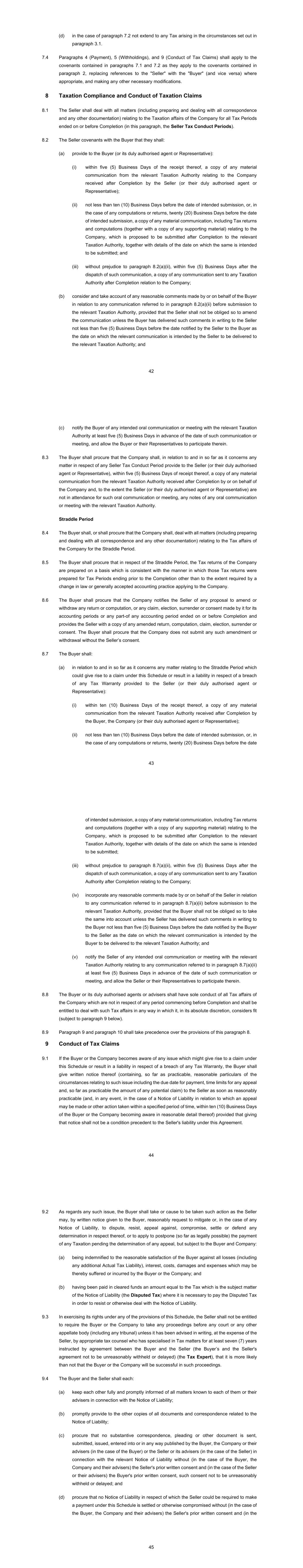 42 (d) in the case of paragraph 7.2 not extend to any Tax arising in the circumstances set out in paragraph 3.1. 7.4 Paragraphs 4 (Payment), 5 (Withholdings), and 9 (Conduct of Tax Claims) shall apply to the covenants contained in paragraphs 7.1 and 7.2 as they apply to the covenants contained in paragraph 2, replacing references to the "Seller" with the "Buyer" (and vice versa) where appropriate, and making any other necessary modifications. 8 Taxation Compliance and Conduct of Taxation Claims 8.1 The Seller shall deal with all matters (including preparing and dealing with all correspondence and any other documentation) relating to the Taxation affairs of the Company for all Tax Periods ended on or before Completion (in this paragraph, the Seller Tax Conduct Periods). 8.2 The Seller covenants with the Buyer that they shall: (a) provide to the Buyer (or its duly authorised agent or Representative): (i) within five (5) Business Days of the receipt thereof, a copy of any material communication from the relevant Taxation Authority relating to the Company received after Completion by the Seller (or their duly authorised agent or Representative); (ii) not less than ten (10) Business Days before the date of intended submission, or, in the case of any computations or returns, twenty (20) Business Days before the date of intended submission, a copy of any material communication, including Tax returns and computations (together with a copy of any supporting material) relating to the Company, which is proposed to be submitted after Completion to the relevant Taxation Authority, together with details of the date on which the same is intended to be submitted; and (iii) without prejudice to paragraph 8.2(a)(ii), within five (5) Business Days after the dispatch of such communication, a copy of any communication sent to any Taxation Authority after Completion relation to the Company; (b) consider and take account of any reasonable comments made by or on behalf of the Buyer in relation to any communication referred to in paragraph 8.2(a)(ii) before submission to the relevant Taxation Authority, provided that the Seller shall not be obliged so to amend the communication unless the Buyer has delivered such comments in writing to the Seller not less than five (5) Business Days before the date notified by the Seller to the Buyer as the date on which the relevant communication is intended by the Seller to be delivered to the relevant Taxation Authority; and 43 (c) notify the Buyer of any intended oral communication or meeting with the relevant Taxation Authority at least five (5) Business Days in advance of the date of such communication or meeting, and allow the Buyer or their Representatives to participate therein. 8.3 The Buyer shall procure that the Company shall, in relation to and in so far as it concerns any matter in respect of any Seller Tax Conduct Period provide to the Seller (or their duly authorised agent or Representative), within five (5) Business Days of receipt thereof, a copy of any material communication from the relevant Taxation Authority received after Completion by or on behalf of the Company and, to the extent the Seller (or their duly authorised agent or Representative) are not in attendance for such oral communication or meeting, any notes of any oral communication or meeting with the relevant Taxation Authority. Straddle Period 8.4 The Buyer shall, or shall procure that the Company shall, deal with all matters (including preparing and dealing with all correspondence and any other documentation) relating to the Tax affairs of the Company for the Straddle Period. 8.5 The Buyer shall procure that in respect of the Straddle Period, the Tax returns of the Company are prepared on a basis which is consistent with the manner in which those Tax returns were prepared for Tax Periods ending prior to the Completion other than to the extent required by a change in law or generally accepted accounting practice applying to the Company. 8.6 The Buyer shall procure that the Company notifies the Seller of any proposal to amend or withdraw any return or computation, or any claim, election, surrender or consent made by it for its accounting periods or any part-of any accounting period ended on or before Completion and provides the Seller with a copy of any amended return, computation, claim, election, surrender or consent. The Buyer shall procure that the Company does not submit any such amendment or withdrawal without the Seller’s consent. 8.7 The Buyer shall: (a) in relation to and in so far as it concerns any matter relating to the Straddle Period which could give rise to a claim under this Schedule or result in a liability in respect of a breach of any Tax Warranty provided to the Seller (or their duly authorised agent or Representative): (i) within ten (10) Business Days of the receipt thereof, a copy of any material communication from the relevant Taxation Authority received after Completion by the Buyer, the Company (or their duly authorised agent or Representative); (ii) not less than ten (10) Business Days before the date of intended submission, or, in the case of any computations or returns, twenty (20) Business Days before the date 44 of intended submission, a copy of any material communication, including Tax returns and computations (together with a copy of any supporting material) relating to the Company, which is proposed to be submitted after Completion to the relevant Taxation Authority, together with details of the date on which the same is intended to be submitted; (iii) without prejudice to paragraph 8.7(a)(ii), within five (5) Business Days after the dispatch of such communication, a copy of any communication sent to any Taxation Authority after Completion relating to the Company; (iv) incorporate any reasonable comments made by or on behalf of the Seller in relation to any communication referred to in paragraph 8.7(a)(ii) before submission to the relevant Taxation Authority, pro