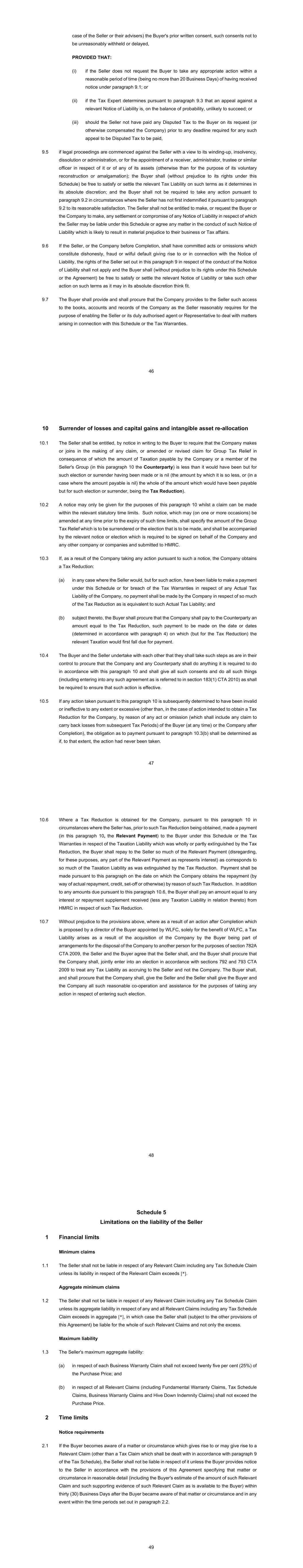 38 (i) such Tax Liability comprises interest or penalties arising by virtue of any underpayment of taxation payable in instalments under the Corporation Tax (Instalment Payments) Regulations 1998 for the accounting period commencing prior to Completion in so far as any such underpayment would not have been an underpayment but for an Event occurring after Completion; or (j) a Seller Relief is available or is made available in each case for no consideration to extinguish or reduce such Tax Liability; or (k) the Buyer or that person has received from any other person (other than the Company) a payment (or has otherwise been compensated) in respect of such Tax Liability for no cost; or (l) any profits to which that Tax Liability is attributable were actually earned or received by or accrue to the Company on or before Completion and were not reflected but should have been reflected in the Completion Accounts (based on the principles used to draw up the Completion Accounts) and, as a result of being so reflected, would have resulted in an increase in the price payable for the Company’s net assets; and the benefit of which was retained in cash by the Company at Completion and except to the extent that the amount of the Tax Liability exceeds the amount of the relevant income, profits or gain; or (m) such Tax Liability arises as a result of (i) the Company ceasing to be a qualifying company after Completion for the purposes of Part 3 Schedule 7AC TCGA 1992 or (ii) the acquisition of the Company being part of arrangements for the disposal by the Buyer of the Company to another person for the purposes of section 782A CTA 2009, save where this arises as a result of an action after Completion which is proposed by a director of the Buyer appointed by WLFC, solely for the benefit of WLFC; or (n) such Tax Liability arises as a result of, in respect of, or by reference to, any income, profit or gains earned, accrued or received after Completion, or any Event occurring or deemed to occur after Completion. 3.2 The provisions of paragraph 3.1 shall also operate to limit or reduce the liability of the Seller in respect of claims under the Tax Warranties as if references in paragraph 3.1 to Tax Liability were references to the loss, circumstance or other liability giving rise to the breach of the relevant Tax Warranty. 39 4 Payment 4.1 The Seller shall pay to the Buyer in cleared funds any amount due under this Schedule, whether or not the Buyer or the Company is or may be entitled to claim reimbursement of the Tax Liability from any other body person or authority, on or before: (a) in the case of an Actual Tax Liability, the date which is the later of the date falling five Business Days after the Buyer has served written notice demanding that payment (Notice Date) and the date falling three (3) Business Days before the last date on which the Tax in question is required to be paid to the relevant Taxation Authority without any interest or penalties arising in respect of it; (b) in the case of a liability falling with sub-paragraph (a) of the definition of Deemed Tax Liability, the date which is the later of the Notice Date and three (3) Business Days before the last day on which Tax would have been payable (but for the application of the Relief) to the relevant Taxation Authority without any interest or penalties arising in respect of it; (c) in the case of a liability falling with sub-paragraph (b) of the definition of Deemed Tax Liability, the date which is the later of the Notice Date and the date on which such repayment would otherwise have been repaid by the relevant Taxation Authority; (d) in the case of a liability falling with sub-paragraph (c) of the definition of Deemed Tax Liability, the date which is the later of the Notice Date and three (3) Business Days before the last day on which such Tax which would have otherwise been saved becomes due and payable to the relevant Taxation Authority without any interest or penalties arising in respect of it; and (e) in any other case (including an amount claimed under paragraph 2.1(c)) which is not covered by the preceding paragraphs, the Notice Date where accompanied by satisfactory evidence that the relevant loss, cost, expense or payment has been incurred. 5 Withholdings 5.1 All sums payable by the Buyer or the Seller (for the purposes if this paragraph 5.1 and 5.2 below a Payor) under this Agreement (other than the Purchase Price) shall be paid free and clear of all deductions, withholdings, set-offs or counterclaims unless a deduction or withholding is required by law in which event the Payor shall: (i) provide such evidence of the relevant withholding or deduction as the recipient may reasonably require; and (ii) pay such additional amount as shall be required to ensure that the net amount received and retained by the recipient under this Agreement will (after such deduction or withholding has been made) equal the full amount that would have been received and retained by it had no such deduction or withholding been required to be made. 40 5.2 If a sum payable by a Payor to a recipient under this Agreement is increased by operation of paragraph 5.1 and the recipient receives, is granted or determines that a Relief attributable to such increased payment has been obtained, the recipient shall repay to the Payor such amount as the recipient determines will leave the recipient in the same after Tax position (after repayment) as it would have been in had an additional amount not been required to be paid under paragraph 5.1, and such repayment shall be made not later than five (5) Business Days after the recipient makes the relevant determination. 5.3 If any Taxation Authority charges to Tax any sum paid (the Original Payment) to the Buyer or the Seller under this Agreement (the Recipient) by the Buyer or Seller (the Payor) in respect of any breach, indemnity or other form of compensation (including, but not limited to, payments under this Schedule) the Pay