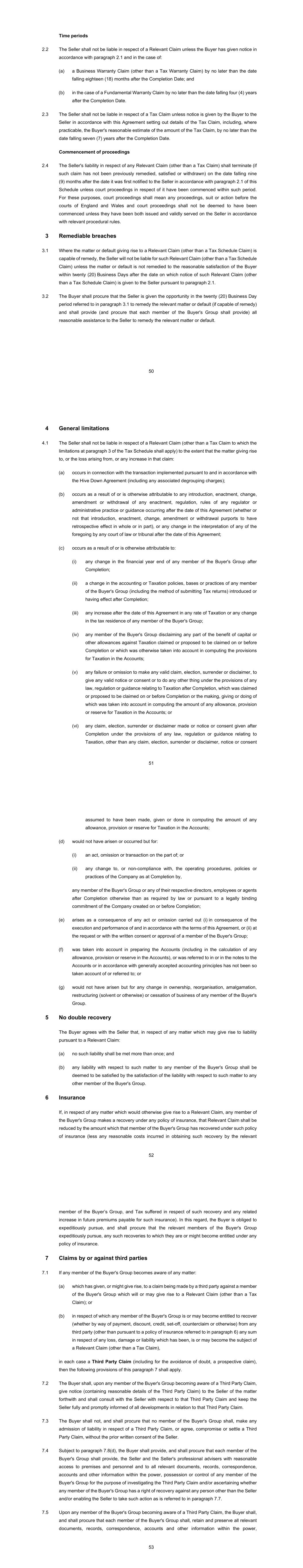 50 Time periods 2.2 The Seller shall not be liable in respect of a Relevant Claim unless the Buyer has given notice in accordance with paragraph 2.1 and in the case of: (a) a Business Warranty Claim (other than a Tax Warranty Claim) by no later than the date falling eighteen (18) months after the Completion Date; and (b) in the case of a Fundamental Warranty Claim by no later than the date falling four (4) years after the Completion Date. 2.3 The Seller shall not be liable in respect of a Tax Claim unless notice is given by the Buyer to the Seller in accordance with this Agreement setting out details of the Tax Claim, including, where practicable, the Buyer's reasonable estimate of the amount of the Tax Claim, by no later than the date falling seven (7) years after the Completion Date. Commencement of proceedings 2.4 The Seller's liability in respect of any Relevant Claim (other than a Tax Claim) shall terminate (if such claim has not been previously remedied, satisfied or withdrawn) on the date falling nine (9) months after the date it was first notified to the Seller in accordance with paragraph 2.1 of this Schedule unless court proceedings in respect of it have been commenced within such period. For these purposes, court proceedings shall mean any proceedings, suit or action before the courts of England and Wales and court proceedings shall not be deemed to have been commenced unless they have been both issued and validly served on the Seller in accordance with relevant procedural rules. 3 Remediable breaches 3.1 Where the matter or default giving rise to a Relevant Claim (other than a Tax Schedule Claim) is capable of remedy, the Seller will not be liable for such Relevant Claim (other than a Tax Schedule Claim) unless the matter or default is not remedied to the reasonable satisfaction of the Buyer within twenty (20) Business Days after the date on which notice of such Relevant Claim (other than a Tax Schedule Claim) is given to the Seller pursuant to paragraph 2.1. 3.2 The Buyer shall procure that the Seller is given the opportunity in the twenty (20) Business Day period referred to in paragraph 3.1 to remedy the relevant matter or default (if capable of remedy) and shall provide (and procure that each member of the Buyer's Group shall provide) all reasonable assistance to the Seller to remedy the relevant matter or default. 51 4 General limitations 4.1 The Seller shall not be liable in respect of a Relevant Claim (other than a Tax Claim to which the limitations at paragraph 3 of the Tax Schedule shall apply) to the extent that the matter giving rise to, or the loss arising from, or any increase in that claim: (a) occurs in connection with the transaction implemented pursuant to and in accordance with the Hive Down Agreement (including any associated degrouping charges); (b) occurs as a result of or is otherwise attributable to any introduction, enactment, change, amendment or withdrawal of any enactment, regulation, rules of any regulator or administrative practice or guidance occurring after the date of this Agreement (whether or not that introduction, enactment, change, amendment or withdrawal purports to have retrospective effect in whole or in part), or any change in the interpretation of any of the foregoing by any court of law or tribunal after the date of this Agreement; (c) occurs as a result of or is otherwise attributable to: (i) any change in the financial year end of any member of the Buyer's Group after Completion; (ii) a change in the accounting or Taxation policies, bases or practices of any member of the Buyer's Group (including the method of submitting Tax returns) introduced or having effect after Completion; (iii) any increase after the date of this Agreement in any rate of Taxation or any change in the tax residence of any member of the Buyer's Group; (iv) any member of the Buyer's Group disclaiming any part of the benefit of capital or other allowances against Taxation claimed or proposed to be claimed on or before Completion or which was otherwise taken into account in computing the provisions for Taxation in the Accounts; (v) any failure or omission to make any valid claim, election, surrender or disclaimer, to give any valid notice or consent or to do any other thing under the provisions of any law, regulation or guidance relating to Taxation after Completion, which was claimed or proposed to be claimed on or before Completion or the making, giving or doing of which was taken into account in computing the amount of any allowance, provision or reserve for Taxation in the Accounts; or (vi) any claim, election, surrender or disclaimer made or notice or consent given after Completion under the provisions of any law, regulation or guidance relating to Taxation, other than any claim, election, surrender or disclaimer, notice or consent 52 assumed to have been made, given or done in computing the amount of any allowance, provision or reserve for Taxation in the Accounts; (d) would not have arisen or occurred but for: (i) an act, omission or transaction on the part of; or (ii) any change to, or non-compliance with, the operating procedures, policies or practices of the Company as at Completion by, any member of the Buyer's Group or any of their respective directors, employees or agents after Completion otherwise than as required by law or pursuant to a legally binding commitment of the Company created on or before Completion; (e) arises as a consequence of any act or omission carried out (i) in consequence of the execution and performance of and in accordance with the terms of this Agreement, or (ii) at the request or with the written consent or approval of a member of the Buyer's Group; (f) was taken into account in preparing the Accounts (including in the calculation of any allowance, provision or reserve in the Accounts), or was referred to in or in the notes to the Accounts or in accordance with generally accepted accounting principles has not been so taken acc