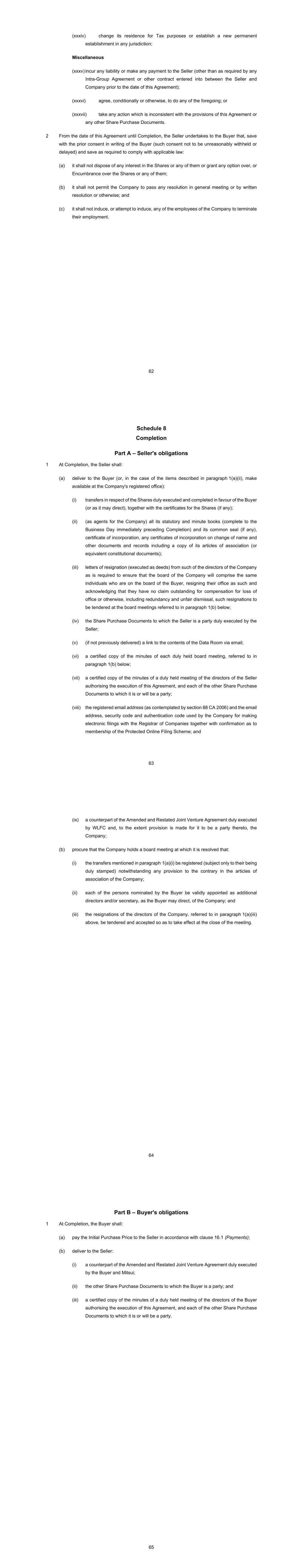62 (xxxiv) change its residence for Tax purposes or establish a new permanent establishment in any jurisdiction; Miscellaneous (xxxv) incur any liability or make any payment to the Seller (other than as required by any Intra-Group Agreement or other contract entered into between the Seller and Company prior to the date of this Agreement); (xxxvi) agree, conditionally or otherwise, to do any of the foregoing; or (xxxvii) take any action which is inconsistent with the provisions of this Agreement or any other Share Purchase Documents. 2 From the date of this Agreement until Completion, the Seller undertakes to the Buyer that, save with the prior consent in writing of the Buyer (such consent not to be unreasonably withheld or delayed) and save as required to comply with applicable law: it shall not dispose of any interest in the Shares or any of them or grant any option over, or Encumbrance over the Shares or any of them; it shall not permit the Company to pass any resolution in general meeting or by written resolution or otherwise; and it shall not induce, or attempt to induce, any of the employees of the Company to terminate their employment. 63 Completion Part A – Seller's obligations 1 At Completion, the Seller shall: deliver to the Buyer (or, in the case of the items described in paragraph 1(a)(ii), make available at the Company's registered office): (i) transfers in respect of the Shares duly executed and completed in favour of the Buyer (or as it may direct), together with the certificates for the Shares (if any); (ii) (as agents for the Company) all its statutory and minute books (complete to the Business Day immediately preceding Completion) and its common seal (if any), certificate of incorporation, any certificates of incorporation on change of name and other documents and records including a copy of its articles of association (or equivalent constitutional documents); (iii) letters of resignation (executed as deeds) from such of the directors of the Company as is required to ensure that the board of the Company will comprise the same individuals who are on the board of the Buyer, resigning their office as such and acknowledging that they have no claim outstanding for compensation for loss of office or otherwise, including redundancy and unfair dismissal, such resignations to be tendered at the board meetings referred to in paragraph 1(b) below; (iv) the Share Purchase Documents to which the Seller is a party duly executed by the Seller; (v) (if not previously delivered) a link to the contents of the Data Room via email; (vi) a certified copy of the minutes of each duly held board meeting, referred to in paragraph 1(b) below; (vii) a certified copy of the minutes of a duly held meeting of the directors of the Seller authorising the execution of this Agreement, and each of the other Share Purchase Documents to which it is or will be a party; (viii) the registered email address (as contemplated by section 88 CA 2006) and the email address, security code and authentication code used by the Company for making electronic filings with the Registrar of Companies together with confirmation as to membership of the Protected Online Filing Scheme; and 64 (ix) a counterpart of the Amended and Restated Joint Venture Agreement duly executed by WLFC and, to the extent provision is made for it to be a party thereto, the Company; procure that the Company holds a board meeting at which it is resolved that: (i) the transfers mentioned in paragraph 1(a)(i) be registered (subject only to their being duly stamped) notwithstanding any provision to the contrary in the articles of association of the Company; (ii) each of the persons nominated by the Buyer be validly appointed as additional directors and/or secretary, as the Buyer may direct, of the Company; and (iii) the resignations of the directors of the Company, referred to in paragraph 1(a)(iii) above, be tendered and accepted so as to take effect at the close of the meeting. 65 Part B – Buyer's obligations 1 At Completion, the Buyer shall: pay the Initial Purchase Price to the Seller in accordance with clause 16.1 (Payments); deliver to the Seller: (i) a counterpart of the Amended and Restated Joint Venture Agreement duly executed by the Buyer and Mitsui; (ii) the other Share Purchase Documents to which the Buyer is a party; and (iii) a certified copy of the minutes of a duly held meeting of the directors of the Buyer authorising the execution of this Agreement, and each of the other Share Purchase Documents to which it is or will be a party.