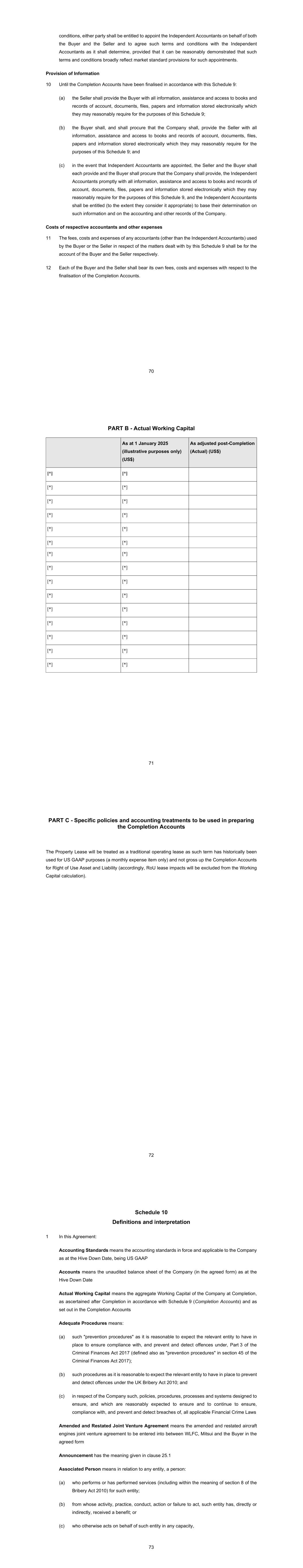 70 conditions, either party shall be entitled to appoint the Independent Accountants on behalf of both the Buyer and the Seller and to agree such terms and conditions with the Independent Accountants as it shall determine, provided that it can be reasonably demonstrated that such terms and conditions broadly reflect market standard provisions for such appointments. Provision of Information 10 Until the Completion Accounts have been finalised in accordance with this Schedule 9: the Seller shall provide the Buyer with all information, assistance and access to books and records of account, documents, files, papers and information stored electronically which they may reasonably require for the purposes of this Schedule 9; the Buyer shall, and shall procure that the Company shall, provide the Seller with all information, assistance and access to books and records of account, documents, files, papers and information stored electronically which they may reasonably require for the purposes of this Schedule 9; and in the event that Independent Accountants are appointed, the Seller and the Buyer shall each provide and the Buyer shall procure that the Company shall provide, the Independent Accountants promptly with all information, assistance and access to books and records of account, documents, files, papers and information stored electronically which they may reasonably require for the purposes of this Schedule 9, and the Independent Accountants shall be entitled (to the extent they consider it appropriate) to base their determination on such information and on the accounting and other records of the Company. Costs of respective accountants and other expenses 11 The fees, costs and expenses of any accountants (other than the Independent Accountants) used by the Buyer or the Seller in respect of the matters dealt with by this Schedule 9 shall be for the account of the Buyer and the Seller respectively. 12 Each of the Buyer and the Seller shall bear its own fees, costs and expenses with respect to the finalisation of the Completion Accounts. 71 PART B - Actual Working Capital As at 1 January 2025 (illustrative purposes only) (US$) As adjusted post-Completion (Actual) (US$) [*] [*] [*] [*] [*] [*] [*] [*] [*] [*] [*] [*] [*] [*] [*] [*] [*] [*] [*] [*] [*] [*] [*] [*] [*] [*] [*] [*] [*] [*] 72 PART C - Specific policies and accounting treatments to be used in preparing the Completion Accounts The Property Lease will be treated as a traditional operating lease as such term has historically been used for US GAAP purposes (a monthly expense item only) and not gross up the Completion Accounts for Right of Use Asset and Liability (accordingly, RoU lease impacts will be excluded from the Working Capital calculation). 73 Definitions and interpretation 1 In this Agreement: Accounting Standards means the accounting standards in force and applicable to the Company as at the Hive Down Date, being US GAAP Accounts means the unaudited balance sheet of the Company (in the agreed form) as at the Hive Down Date Actual Working Capital means the aggregate Working Capital of the Company at Completion, as ascertained after Completion in accordance with Schedule 9 (Completion Accounts) and as set out in the Completion Accounts Adequate Procedures means: such "prevention procedures" as it is reasonable to expect the relevant entity to have in place to ensure compliance with, and prevent and detect offences under, Part 3 of the Criminal Finances Act 2017 (defined also as "prevention procedures" in section 45 of the Criminal Finances Act 2017); such procedures as it is reasonable to expect the relevant entity to have in place to prevent and detect offences under the UK Bribery Act 2010; and in respect of the Company such, policies, procedures, processes and systems designed to ensure, and which are reasonably expected to ensure and to continue to ensure, compliance with, and prevent and detect breaches of, all applicable Financial Crime Laws Amended and Restated Joint Venture Agreement means the amended and restated aircraft engines joint venture agreement to be entered into between WLFC, Mitsui and the Buyer in the agreed form Announcement has the meaning given in clause 25.1 Associated Person means in relation to any entity, a person: who performs or has performed services (including within the meaning of section 8 of the Bribery Act 2010) for such entity; from whose activity, practice, conduct, action or failure to act, such entity has, directly or indirectly, received a benefit; or who otherwise acts on behalf of such entity in any capacity,