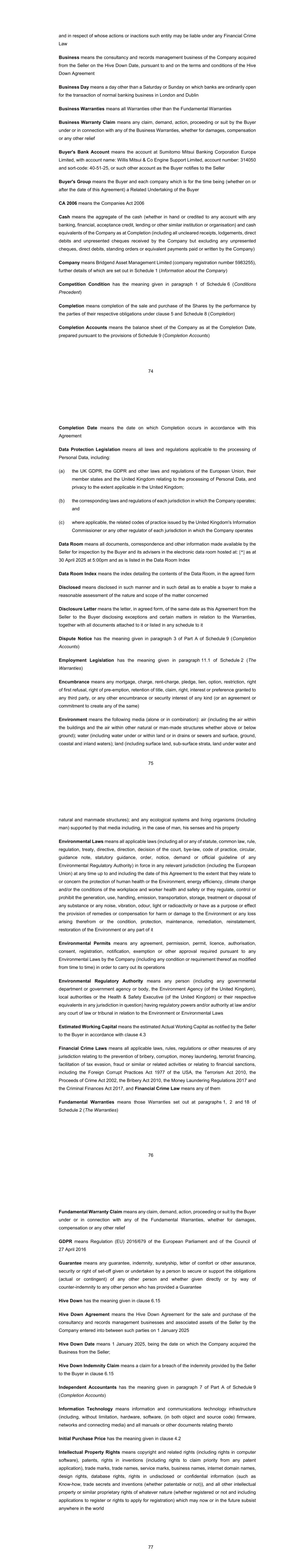 74 and in respect of whose actions or inactions such entity may be liable under any Financial Crime Law Business means the consultancy and records management business of the Company acquired from the Seller on the Hive Down Date, pursuant to and on the terms and conditions of the Hive Down Agreement Business Day means a day other than a Saturday or Sunday on which banks are ordinarily open for the transaction of normal banking business in London and Dublin Business Warranties means all Warranties other than the Fundamental Warranties Business Warranty Claim means any claim, demand, action, proceeding or suit by the Buyer under or in connection with any of the Business Warranties, whether for damages, compensation or any other relief Buyer's Bank Account means the account at Sumitomo Mitsui Banking Corporation Europe Limited, with account name: Willis Mitsui & Co Engine Support Limited, account number: 314050 and sort-code: 40-51-25, or such other account as the Buyer notifies to the Seller Buyer's Group means the Buyer and each company which is for the time being (whether on or after the date of this Agreement) a Related Undertaking of the Buyer CA 2006 means the Companies Act 2006 Cash means the aggregate of the cash (whether in hand or credited to any account with any banking, financial, acceptance credit, lending or other similar institution or organisation) and cash equivalents of the Company as at Completion (including all uncleared receipts, lodgements, direct debits and unpresented cheques received by the Company but excluding any unpresented cheques, direct debits, standing orders or equivalent payments paid or written by the Company) Company means Bridgend Asset Management Limited (company registration number 5983255), further details of which are set out in Schedule 1 (Information about the Company) Competition Condition has the meaning given in paragraph 1 of Schedule 6 (Conditions Precedent) Completion means completion of the sale and purchase of the Shares by the performance by the parties of their respective obligations under clause 5 and Schedule 8 (Completion) Completion Accounts means the balance sheet of the Company as at the Completion Date, prepared pursuant to the provisions of Schedule 9 (Completion Accounts) 75 Completion Date means the date on which Completion occurs in accordance with this Agreement Data Protection Legislation means all laws and regulations applicable to the processing of Personal Data, including: the UK GDPR, the GDPR and other laws and regulations of the European Union, their member states and the United Kingdom relating to the processing of Personal Data, and privacy to the extent applicable in the United Kingdom; the corresponding laws and regulations of each jurisdiction in which the Company operates; and where applicable, the related codes of practice issued by the United Kingdom's Information Commissioner or any other regulator of each jurisdiction in which the Company operates Data Room means all documents, correspondence and other information made available by the Seller for inspection by the Buyer and its advisers in the electronic data room hosted at: [*] as at 30 April 2025 at 5:00pm and as is listed in the Data Room Index Data Room Index means the index detailing the contents of the Data Room, in the agreed form Disclosed means disclosed in such manner and in such detail as to enable a buyer to make a reasonable assessment of the nature and scope of the matter concerned Disclosure Letter means the letter, in agreed form, of the same date as this Agreement from the Seller to the Buyer disclosing exceptions and certain matters in relation to the Warranties, together with all documents attached to it or listed in any schedule to it Dispute Notice has the meaning given in paragraph 3 of Part A of Schedule 9 (Completion Accounts) Employment Legislation has the meaning given in paragraph 11.1 of Schedule 2 (The Warranties) Encumbrance means any mortgage, charge, rent-charge, pledge, lien, option, restriction, right of first refusal, right of pre-emption, retention of title, claim, right, interest or preference granted to any third party, or any other encumbrance or security interest of any kind (or an agreement or commitment to create any of the same) Environment means the following media (alone or in combination): air (including the air within the buildings and the air within other natural or man-made structures whether above or below ground); water (including water under or within land or in drains or sewers and surface, ground, coastal and inland waters); land (including surface land, sub-surface strata, land under water and 76 natural and manmade structures); and any ecological systems and living organisms (including man) supported by that media including, in the case of man, his senses and his property Environmental Laws means all applicable laws (including all or any of statute, common law, rule, regulation, treaty, directive, direction, decision of the court, bye-law, code of practice, circular, guidance note, statutory guidance, order, notice, demand or official guideline of any Environmental Regulatory Authority) in force in any relevant jurisdiction (including the European Union) at any time up to and including the date of this Agreement to the extent that they relate to or concern the protection of human health or the Environment, energy efficiency, climate change and/or the conditions of the workplace and worker health and safety or they regulate, control or prohibit the generation, use, handling, emission, transportation, storage, treatment or disposal of any substance or any noise, vibration, odour, light or radioactivity or have as a purpose or effect the provision of remedies or compensation for harm or damage to the Environment or any loss arising therefrom or the condition, protection, maintenance, remediation, reinstatement, restoration of the Environment or any part of it Environmental Permits means any agreement, permi