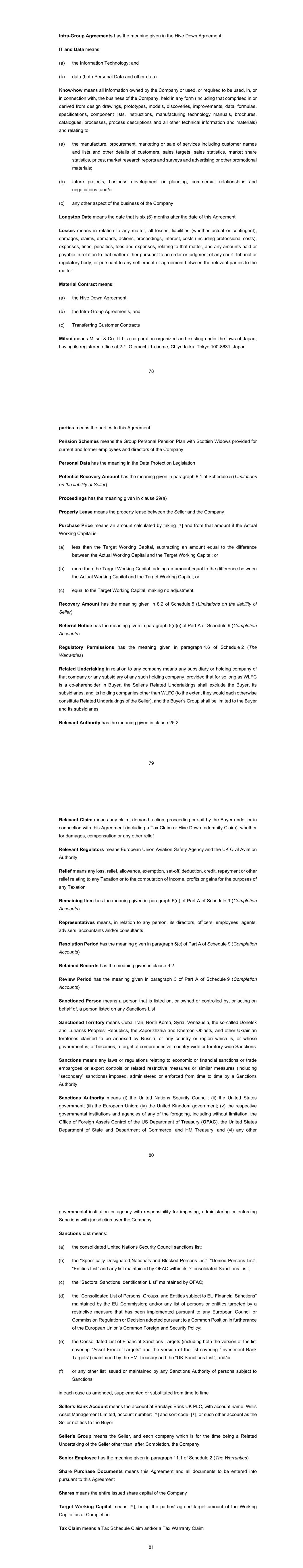 78 Intra-Group Agreements has the meaning given in the Hive Down Agreement IT and Data means: the Information Technology; and data (both Personal Data and other data) Know-how means all information owned by the Company or used, or required to be used, in, or in connection with, the business of the Company, held in any form (including that comprised in or derived from design drawings, prototypes, models, discoveries, improvements, data, formulae, specifications, component lists, instructions, manufacturing technology manuals, brochures, catalogues, processes, process descriptions and all other technical information and materials) and relating to: the manufacture, procurement, marketing or sale of services including customer names and lists and other details of customers, sales targets, sales statistics, market share statistics, prices, market research reports and surveys and advertising or other promotional materials; future projects, business development or planning, commercial relationships and negotiations; and/or any other aspect of the business of the Company Longstop Date means the date that is six (6) months after the date of this Agreement Losses means in relation to any matter, all losses, liabilities (whether actual or contingent), damages, claims, demands, actions, proceedings, interest, costs (including professional costs), expenses, fines, penalties, fees and expenses, relating to that matter, and any amounts paid or payable in relation to that matter either pursuant to an order or judgment of any court, tribunal or regulatory body, or pursuant to any settlement or agreement between the relevant parties to the matter Material Contract means: the Hive Down Agreement; the Intra-Group Agreements; and Transferring Customer Contracts Mitsui means Mitsui & Co. Ltd., a corporation organized and existing under the laws of Japan, having its registered office at 2-1, Otemachi 1-chome, Chiyoda-ku, Tokyo 100-8631, Japan 79 parties means the parties to this Agreement Pension Schemes means the Group Personal Pension Plan with Scottish Widows provided for current and former employees and directors of the Company Personal Data has the meaning in the Data Protection Legislation Potential Recovery Amount has the meaning given in paragraph 8.1 of Schedule 5 (Limitations on the liability of Seller) Proceedings has the meaning given in clause 29(a) Property Lease means the property lease between the Seller and the Company Purchase Price means an amount calculated by taking [*] and from that amount if the Actual Working Capital is: (a) less than the Target Working Capital, subtracting an amount equal to the difference between the Actual Working Capital and the Target Working Capital; or (b) more than the Target Working Capital, adding an amount equal to the difference between the Actual Working Capital and the Target Working Capital; or (c) equal to the Target Working Capital, making no adjustment. Recovery Amount has the meaning given in 8.2 of Schedule 5 (Limitations on the liability of Seller) Referral Notice has the meaning given in paragraph 5(d)(i) of Part A of Schedule 9 (Completion Accounts) Regulatory Permissions has the meaning given in paragraph 4.6 of Schedule 2 (The Warranties) Related Undertaking in relation to any company means any subsidiary or holding company of that company or any subsidiary of any such holding company, provided that for so long as WLFC is a co-shareholder in Buyer, the Seller's Related Undertakings shall exclude the Buyer, its subsidiaries, and its holding companies other than WLFC (to the extent they would each otherwise constitute Related Undertakings of the Seller), and the Buyer's Group shall be limited to the Buyer and its subsidiaries Relevant Authority has the meaning given in clause 25.2 80 Relevant Claim means any claim, demand, action, proceeding or suit by the Buyer under or in connection with this Agreement (including a Tax Claim or Hive Down Indemnity Claim), whether for damages, compensation or any other relief Relevant Regulators means European Union Aviation Safety Agency and the UK Civil Aviation Authority Relief means any loss, relief, allowance, exemption, set-off, deduction, credit, repayment or other relief relating to any Taxation or to the computation of income, profits or gains for the purposes of any Taxation Remaining Item has the meaning given in paragraph 5(d) of Part A of Schedule 9 (Completion Accounts) Representatives means, in relation to any person, its directors, officers, employees, agents, advisers, accountants and/or consultants Resolution Period has the meaning given in paragraph 5(c) of Part A of Schedule 9 (Completion Accounts) Retained Records has the meaning given in clause 9.2 Review Period has the meaning given in paragraph 3 of Part A of Schedule 9 (Completion Accounts) Sanctioned Person means a person that is listed on, or owned or controlled by, or acting on behalf of, a person listed on any Sanctions List Sanctioned Territory means Cuba, Iran, North Korea, Syria, Venezuela, the so-called Donetsk and Luhansk Peoples’ Republics, the Zaporizhzhia and Kherson Oblasts, and other Ukrainian territories claimed to be annexed by Russia, or any country or region which is, or whose government is, or becomes, a target of comprehensive, country-wide or territory-wide Sanctions Sanctions means any laws or regulations relating to economic or financial sanctions or trade embargoes or export controls or related restrictive measures or similar measures (including “secondary” sanctions) imposed, administered or enforced from time to time by a Sanctions Authority Sanctions Authority means (i) the United Nations Security Council; (ii) the United States government; (iii) the European Union; (iv) the United Kingdom government; (v) the respective governmental institutions and agencies of any of the foregoing, including without limitation, the Office of Foreign Assets Control of the US Department of Treasury (OFAC), the United States