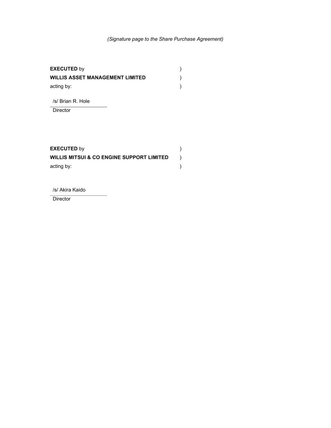(Signature page to the Share Purchase Agreement) EXECUTED by ) WILLIS ASSET MANAGEMENT LIMITED ) acting by: ) /s/ Brian R. Hole Director EXECUTED by ) WILLIS MITSUI & CO ENGINE SUPPORT LIMITED ) acting by: ) /s/ Akira Kaido Director