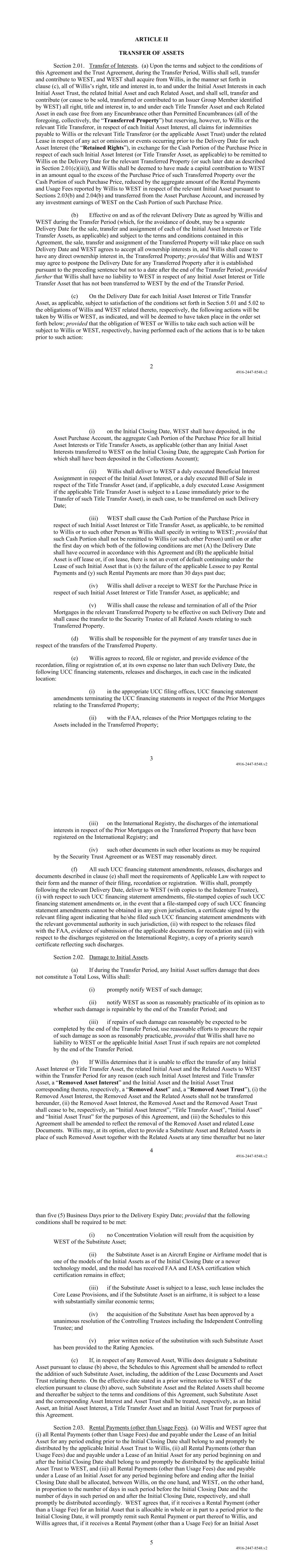 2 4916-2447-8548.v2 ARTICLE II TRANSFER OF ASSETS Section 2.01. Transfer of Interests. (a) Upon the terms and subject to the conditions of this Agreement and the Trust Agreement, during the Transfer Period, Willis shall sell, transfer and contribute to WEST, and WEST shall acquire from Willis, in the manner set forth in clause (c), all of Willis’s right, title and interest in, to and under the Initial Asset Interests in each Initial Asset Trust, the related Initial Asset and each Related Asset, and shall sell, transfer and contribute (or cause to be sold, transferred or contributed to an Issuer Group Member identified by WEST) all right, title and interest in, to and under each Title Transfer Asset and each Related Asset in each case free from any Encumbrance other than Permitted Encumbrances (all of the foregoing, collectively, the “Transferred Property”) but reserving, however, to Willis or the relevant Title Transferor, in respect of each Initial Asset Interest, all claims for indemnities payable to Willis or the relevant Title Transferor (or the applicable Asset Trust) under the related Lease in respect of any act or omission or events occurring prior to the Delivery Date for such Asset Interest (the “Retained Rights”), in exchange for the Cash Portion of the Purchase Price in respect of each such Initial Asset Interest (or Title Transfer Asset, as applicable) to be remitted to Willis on the Delivery Date for the relevant Transferred Property (or such later date as described in Section 2.01(c)(iii)), and Willis shall be deemed to have made a capital contribution to WEST in an amount equal to the excess of the Purchase Price of such Transferred Property over the Cash Portion of such Purchase Price, reduced by the aggregate amount of the Rental Payments and Usage Fees reported by Willis to WEST in respect of the relevant Initial Asset pursuant to Sections 2.03(b) and 2.04(b) and transferred from the Asset Purchase Account, and increased by any investment earnings of WEST on the Cash Portion of such Purchase Price. (b) Effective on and as of the relevant Delivery Date as agreed by Willis and WEST during the Transfer Period (which, for the avoidance of doubt, may be a separate Delivery Date for the sale, transfer and assignment of each of the Initial Asset Interests or Title Transfer Assets, as applicable) and subject to the terms and conditions contained in this Agreement, the sale, transfer and assignment of the Transferred Property will take place on such Delivery Date and WEST agrees to accept all ownership interests in, and Willis shall cease to have any direct ownership interest in, the Transferred Property; provided that Willis and WEST may agree to postpone the Delivery Date for any Transferred Property after it is established pursuant to the preceding sentence but not to a date after the end of the Transfer Period; provided further that Willis shall have no liability to WEST in respect of any Initial Asset Interest or Title Transfer Asset that has not been transferred to WEST by the end of the Transfer Period. (c) On the Delivery Date for each Initial Asset Interest or Title Transfer Asset, as applicable, subject to satisfaction of the conditions set forth in Section 5.01 and 5.02 to the obligations of Willis and WEST related thereto, respectively, the following actions will be taken by Willis or WEST, as indicated, and will be deemed to have taken place in the order set forth below; provided that the obligation of WEST or Willis to take each such action will be subject to Willis or WEST, respectively, having performed each of the actions that is to be taken prior to such action: 3 4916-2447-8548.v2 (i) on the Initial Closing Date, WEST shall have deposited, in the Asset Purchase Account, the aggregate Cash Portion of the Purchase Price for all Initial Asset Interests or Title Transfer Assets, as applicable (other than any Initial Asset Interests transferred to WEST on the Initial Closing Date, the aggregate Cash Portion for which shall have been deposited in the Collections Account); (ii) Willis shall deliver to WEST a duly executed Beneficial Interest Assignment in respect of the Initial Asset Interest, or a duly executed Bill of Sale in respect of the Title Transfer Asset (and, if applicable, a duly executed Lease Assignment if the applicable Title Transfer Asset is subject to a Lease immediately prior to the Transfer of such Title Transfer Asset), in each case, to be transferred on such Delivery Date; (iii) WEST shall cause the Cash Portion of the Purchase Price in respect of such Initial Asset Interest or Title Transfer Asset, as applicable, to be remitted to Willis or to such other Person as Willis shall specify in writing to WEST; provided that such Cash Portion shall not be remitted to Willis (or such other Person) until on or after the first day on which both of the following conditions are met (A) the Delivery Date shall have occurred in accordance with this Agreement and (B) the applicable Initial Asset is off lease or, if on lease, there is not an event of default continuing under the Lease of such Initial Asset that is (x) the failure of the applicable Lessee to pay Rental Payments and (y) such Rental Payments are more than 30 days past due; (iv) Willis shall deliver a receipt to WEST for the Purchase Price in respect of such Initial Asset Interest or Title Transfer Asset, as applicable; and (v) Willis shall cause the release and termination of all of the Prior Mortgages in the relevant Transferred Property to be effective on such Delivery Date and shall cause the transfer to the Security Trustee of all Related Assets relating to such Transferred Property. (d) Willis shall be responsible for the payment of any transfer taxes due in respect of the transfers of the Transferred Property. (e) Willis agrees to record, file or register, and provide evidence of the recordation, filing or registration of, at its own expense no later than such Delivery Date, the fo