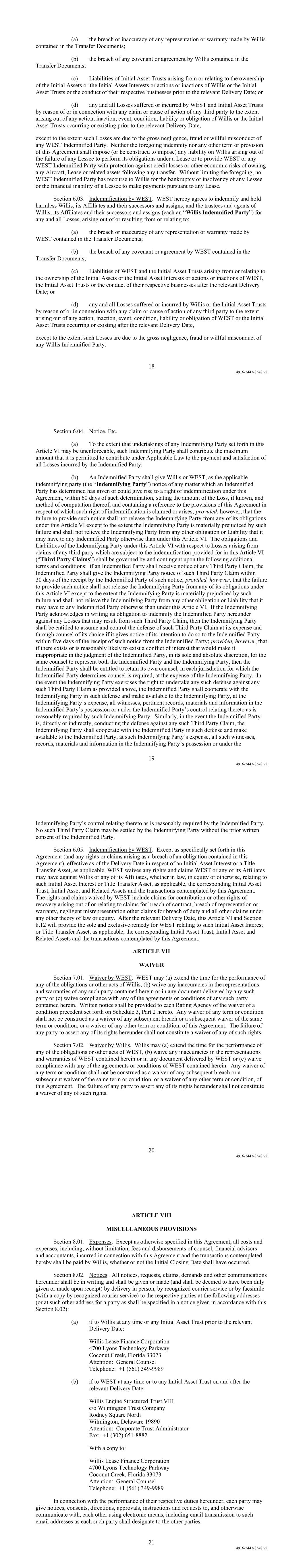 18 4916-2447-8548.v2 (a) the breach or inaccuracy of any representation or warranty made by Willis contained in the Transfer Documents; (b) the breach of any covenant or agreement by Willis contained in the Transfer Documents; (c) Liabilities of Initial Asset Trusts arising from or relating to the ownership of the Initial Assets or the Initial Asset Interests or actions or inactions of Willis or the Initial Asset Trusts or the conduct of their respective businesses prior to the relevant Delivery Date; or (d) any and all Losses suffered or incurred by WEST and Initial Asset Trusts by reason of or in connection with any claim or cause of action of any third party to the extent arising out of any action, inaction, event, condition, liability or obligation of Willis or the Initial Asset Trusts occurring or existing prior to the relevant Delivery Date, except to the extent such Losses are due to the gross negligence, fraud or willful misconduct of any WEST Indemnified Party. Neither the foregoing indemnity nor any other term or provision of this Agreement shall impose (or be construed to impose) any liability on Willis arising out of the failure of any Lessee to perform its obligations under a Lease or to provide WEST or any WEST Indemnified Party with protection against credit losses or other economic risks of owning any Aircraft, Lease or related assets following any transfer. Without limiting the foregoing, no WEST Indemnified Party has recourse to Willis for the bankruptcy or insolvency of any Lessee or the financial inability of a Lessee to make payments pursuant to any Lease. Section 6.03. Indemnification by WEST. WEST hereby agrees to indemnify and hold harmless Willis, its Affiliates and their successors and assigns, and the trustees and agents of Willis, its Affiliates and their successors and assigns (each an “Willis Indemnified Party”) for any and all Losses, arising out of or resulting from or relating to: (a) the breach or inaccuracy of any representation or warranty made by WEST contained in the Transfer Documents; (b) the breach of any covenant or agreement by WEST contained in the Transfer Documents; (c) Liabilities of WEST and the Initial Asset Trusts arising from or relating to the ownership of the Initial Assets or the Initial Asset Interests or actions or inactions of WEST, the Initial Asset Trusts or the conduct of their respective businesses after the relevant Delivery Date; or (d) any and all Losses suffered or incurred by Willis or the Initial Asset Trusts by reason of or in connection with any claim or cause of action of any third party to the extent arising out of any action, inaction, event, condition, liability or obligation of WEST or the Initial Asset Trusts occurring or existing after the relevant Delivery Date, except to the extent such Losses are due to the gross negligence, fraud or willful misconduct of any Willis Indemnified Party. 19 4916-2447-8548.v2 Section 6.04. Notice, Etc. (a) To the extent that undertakings of any Indemnifying Party set forth in this Article VI may be unenforceable, such Indemnifying Party shall contribute the maximum amount that it is permitted to contribute under Applicable Law to the payment and satisfaction of all Losses incurred by the Indemnified Party. (b) An Indemnified Party shall give Willis or WEST, as the applicable indemnifying party (the “Indemnifying Party”) notice of any matter which an Indemnified Party has determined has given or could give rise to a right of indemnification under this Agreement, within 60 days of such determination, stating the amount of the Loss, if known, and method of computation thereof, and containing a reference to the provisions of this Agreement in respect of which such right of indemnification is claimed or arises; provided, however, that the failure to provide such notice shall not release the Indemnifying Party from any of its obligations under this Article VI except to the extent the Indemnifying Party is materially prejudiced by such failure and shall not relieve the Indemnifying Party from any other obligation or Liability that it may have to any Indemnified Party otherwise than under this Article VI. The obligations and Liabilities of the Indemnifying Party under this Article VI with respect to Losses arising from claims of any third party which are subject to the indemnification provided for in this Article VI (“Third Party Claims”) shall be governed by and contingent upon the following additional terms and conditions: if an Indemnified Party shall receive notice of any Third Party Claim, the Indemnified Party shall give the Indemnifying Party notice of such Third Party Claim within 30 days of the receipt by the Indemnified Party of such notice; provided, however, that the failure to provide such notice shall not release the Indemnifying Party from any of its obligations under this Article VI except to the extent the Indemnifying Party is materially prejudiced by such failure and shall not relieve the Indemnifying Party from any other obligation or Liability that it may have to any Indemnified Party otherwise than under this Article VI. If the Indemnifying Party acknowledges in writing its obligation to indemnify the Indemnified Party hereunder against any Losses that may result from such Third Party Claim, then the Indemnifying Party shall be entitled to assume and control the defense of such Third Party Claim at its expense and through counsel of its choice if it gives notice of its intention to do so to the Indemnified Party within five days of the receipt of such notice from the Indemnified Party; provided, however, that if there exists or is reasonably likely to exist a conflict of interest that would make it inappropriate in the judgment of the Indemnified Party, in its sole and absolute discretion, for the same counsel to represent both the Indemnified Party and the Indemnifying Party, then the Indemnified Party shall be entitled to retain its own counsel, in each