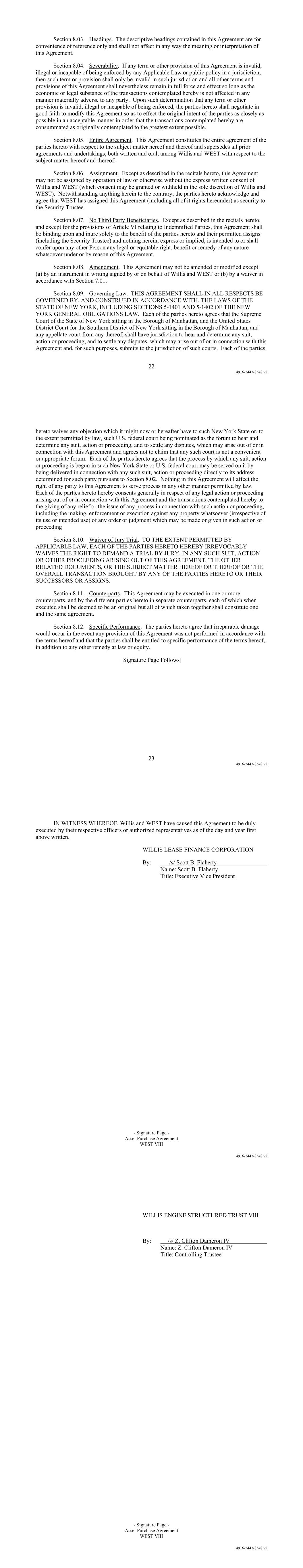 22 4916-2447-8548.v2 Section 8.03. Headings. The descriptive headings contained in this Agreement are for convenience of reference only and shall not affect in any way the meaning or interpretation of this Agreement. Section 8.04. Severability. If any term or other provision of this Agreement is invalid, illegal or incapable of being enforced by any Applicable Law or public policy in a jurisdiction, then such term or provision shall only be invalid in such jurisdiction and all other terms and provisions of this Agreement shall nevertheless remain in full force and effect so long as the economic or legal substance of the transactions contemplated hereby is not affected in any manner materially adverse to any party. Upon such determination that any term or other provision is invalid, illegal or incapable of being enforced, the parties hereto shall negotiate in good faith to modify this Agreement so as to effect the original intent of the parties as closely as possible in an acceptable manner in order that the transactions contemplated hereby are consummated as originally contemplated to the greatest extent possible. Section 8.05. Entire Agreement. This Agreement constitutes the entire agreement of the parties hereto with respect to the subject matter hereof and thereof and supersedes all prior agreements and undertakings, both written and oral, among Willis and WEST with respect to the subject matter hereof and thereof. Section 8.06. Assignment. Except as described in the recitals hereto, this Agreement may not be assigned by operation of law or otherwise without the express written consent of Willis and WEST (which consent may be granted or withheld in the sole discretion of Willis and WEST). Notwithstanding anything herein to the contrary, the parties hereto acknowledge and agree that WEST has assigned this Agreement (including all of it rights hereunder) as security to the Security Trustee. Section 8.07. No Third Party Beneficiaries. Except as described in the recitals hereto, and except for the provisions of Article VI relating to Indemnified Parties, this Agreement shall be binding upon and inure solely to the benefit of the parties hereto and their permitted assigns (including the Security Trustee) and nothing herein, express or implied, is intended to or shall confer upon any other Person any legal or equitable right, benefit or remedy of any nature whatsoever under or by reason of this Agreement. Section 8.08. Amendment. This Agreement may not be amended or modified except (a) by an instrument in writing signed by or on behalf of Willis and WEST or (b) by a waiver in accordance with Section 7.01. Section 8.09. Governing Law. THIS AGREEMENT SHALL IN ALL RESPECTS BE GOVERNED BY, AND CONSTRUED IN ACCORDANCE WITH, THE LAWS OF THE STATE OF NEW YORK, INCLUDING SECTIONS 5-1401 AND 5-1402 OF THE NEW YORK GENERAL OBLIGATIONS LAW. Each of the parties hereto agrees that the Supreme Court of the State of New York sitting in the Borough of Manhattan, and the United States District Court for the Southern District of New York sitting in the Borough of Manhattan, and any appellate court from any thereof, shall have jurisdiction to hear and determine any suit, action or proceeding, and to settle any disputes, which may arise out of or in connection with this Agreement and, for such purposes, submits to the jurisdiction of such courts. Each of the parties 23 4916-2447-8548.v2 hereto waives any objection which it might now or hereafter have to such New York State or, to the extent permitted by law, such U.S. federal court being nominated as the forum to hear and determine any suit, action or proceeding, and to settle any disputes, which may arise out of or in connection with this Agreement and agrees not to claim that any such court is not a convenient or appropriate forum. Each of the parties hereto agrees that the process by which any suit, action or proceeding is begun in such New York State or U.S. federal court may be served on it by being delivered in connection with any such suit, action or proceeding directly to its address determined for such party pursuant to Section 8.02. Nothing in this Agreement will affect the right of any party to this Agreement to serve process in any other manner permitted by law. Each of the parties hereto hereby consents generally in respect of any legal action or proceeding arising out of or in connection with this Agreement and the transactions contemplated hereby to the giving of any relief or the issue of any process in connection with such action or proceeding, including the making, enforcement or execution against any property whatsoever (irrespective of its use or intended use) of any order or judgment which may be made or given in such action or proceeding Section 8.10. Waiver of Jury Trial. TO THE EXTENT PERMITTED BY APPLICABLE LAW, EACH OF THE PARTIES HERETO HEREBY IRREVOCABLY WAIVES THE RIGHT TO DEMAND A TRIAL BY JURY, IN ANY SUCH SUIT, ACTION OR OTHER PROCEEDING ARISING OUT OF THIS AGREEMENT, THE OTHER RELATED DOCUMENTS, OR THE SUBJECT MATTER HEREOF OR THEREOF OR THE OVERALL TRANSACTION BROUGHT BY ANY OF THE PARTIES HERETO OR THEIR SUCCESSORS OR ASSIGNS. Section 8.11. Counterparts. This Agreement may be executed in one or more counterparts, and by the different parties hereto in separate counterparts, each of which when executed shall be deemed to be an original but all of which taken together shall constitute one and the same agreement. Section 8.12. Specific Performance. The parties hereto agree that irreparable damage would occur in the event any provision of this Agreement was not performed in accordance with the terms hereof and that the parties shall be entitled to specific performance of the terms hereof, in addition to any other remedy at law or equity. [Signature Page Follows] - Signature Page - Asset Purchase Agreement WEST VIII 4916-2447-8548.v2 IN WITNESS WHEREOF, Willis and WEST have caused this Agreement to be duly executed by their respec