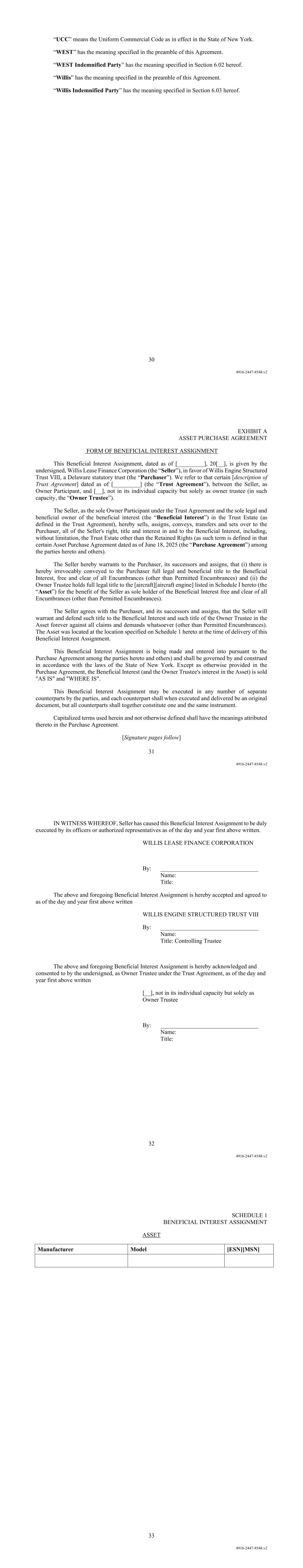 30 4916-2447-8548.v2 “UCC” means the Uniform Commercial Code as in effect in the State of New York. “WEST” has the meaning specified in the preamble of this Agreement. “WEST Indemnified Party” has the meaning specified in Section 6.02 hereof. “Willis” has the meaning specified in the preamble of this Agreement. “Willis Indemnified Party” has the meaning specified in Section 6.03 hereof. 31 4916-2447-8548.v2 EXHIBIT A ASSET PURCHASE AGREEMENT FORM OF BENEFICIAL INTEREST ASSIGNMENT This Beneficial Interest Assignment, dated as of [_________], 20[__], is given by the undersigned, Willis Lease Finance Corporation (the “Seller”), in favor of Willis Engine Structured Trust VIII, a Delaware statutory trust (the “Purchaser”). We refer to that certain [description of Trust Agreement] dated as of [_________] (the “Trust Agreement”), between the Seller, as Owner Participant, and [__], not in its individual capacity but solely as owner trustee (in such capacity, the “Owner Trustee”). The Seller, as the sole Owner Participant under the Trust Agreement and the sole legal and beneficial owner of the beneficial interest (the “Beneficial Interest”) in the Trust Estate (as defined in the Trust Agreement), hereby sells, assigns, conveys, transfers and sets over to the Purchaser, all of the Seller's right, title and interest in and to the Beneficial Interest, including, without limitation, the Trust Estate other than the Retained Rights (as such term is defined in that certain Asset Purchase Agreement dated as of June 18, 2025 (the “Purchase Agreement”) among the parties hereto and others). The Seller hereby warrants to the Purchaser, its successors and assigns, that (i) there is hereby irrevocably conveyed to the Purchaser full legal and beneficial title to the Beneficial Interest, free and clear of all Encumbrances (other than Permitted Encumbrances) and (ii) the Owner Trustee holds full legal title to the [aircraft][aircraft engine] listed in Schedule I hereto (the “Asset”) for the benefit of the Seller as sole holder of the Beneficial Interest free and clear of all Encumbrances (other than Permitted Encumbrances). The Seller agrees with the Purchaser, and its successors and assigns, that the Seller will warrant and defend such title to the Beneficial Interest and such title of the Owner Trustee in the Asset forever against all claims and demands whatsoever (other than Permitted Encumbrances). The Asset was located at the location specified on Schedule 1 hereto at the time of delivery of this Beneficial Interest Assignment. This Beneficial Interest Assignment is being made and entered into pursuant to the Purchase Agreement among the parties hereto and others) and shall be governed by and construed in accordance with the laws of the State of New York. Except as otherwise provided in the Purchase Agreement, the Beneficial Interest (and the Owner Trustee's interest in the Asset) is sold "AS IS" and "WHERE IS". This Beneficial Interest Assignment may be executed in any number of separate counterparts by the parties, and each counterpart shall when executed and delivered be an original document, but all counterparts shall together constitute one and the same instrument. Capitalized terms used herein and not otherwise defined shall have the meanings attributed thereto in the Purchase Agreement. [Signature pages follow] 32 4916-2447-8548.v2 IN WITNESS WHEREOF, Seller has caused this Beneficial Interest Assignment to be duly executed by its officers or authorized representatives as of the day and year first above written. WILLIS LEASE FINANCE CORPORATION By: _________________________________ Name: Title: The above and foregoing Beneficial Interest Assignment is hereby accepted and agreed to as of the day and year first above written WILLIS ENGINE STRUCTURED TRUST VIII By: _________________________________ Name: Title: Controlling Trustee The above and foregoing Beneficial Interest Assignment is hereby acknowledged and consented to by the undersigned, as Owner Trustee under the Trust Agreement, as of the day and year first above written [__], not in its individual capacity but solely as Owner Trustee By: _________________________________ Name: Title: 33 4916-2447-8548.v2 SCHEDULE 1 BENEFICIAL INTEREST ASSIGNMENT ASSET Manufacturer Model [ESN][MSN]